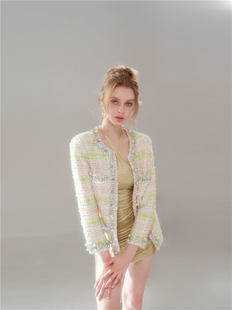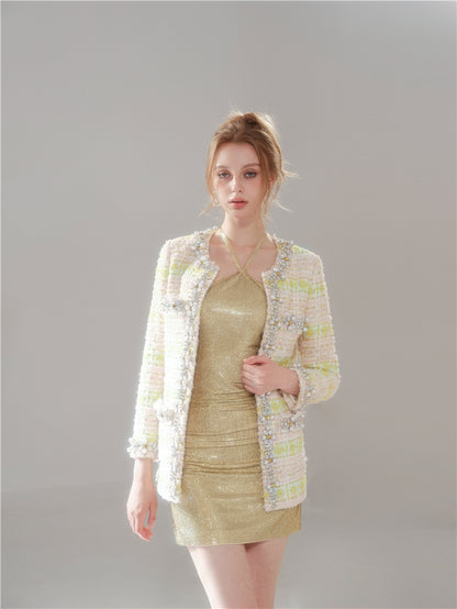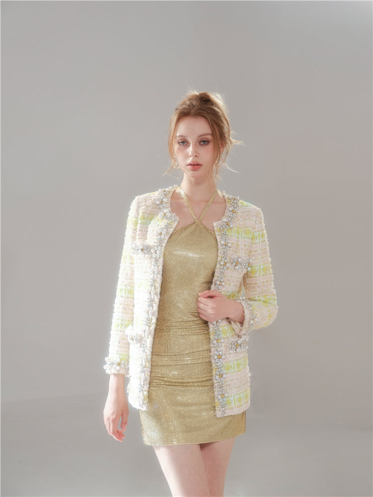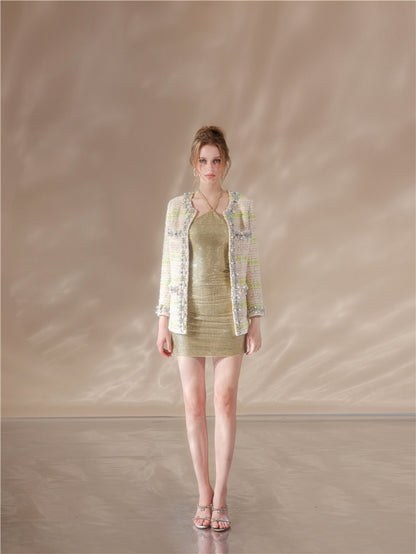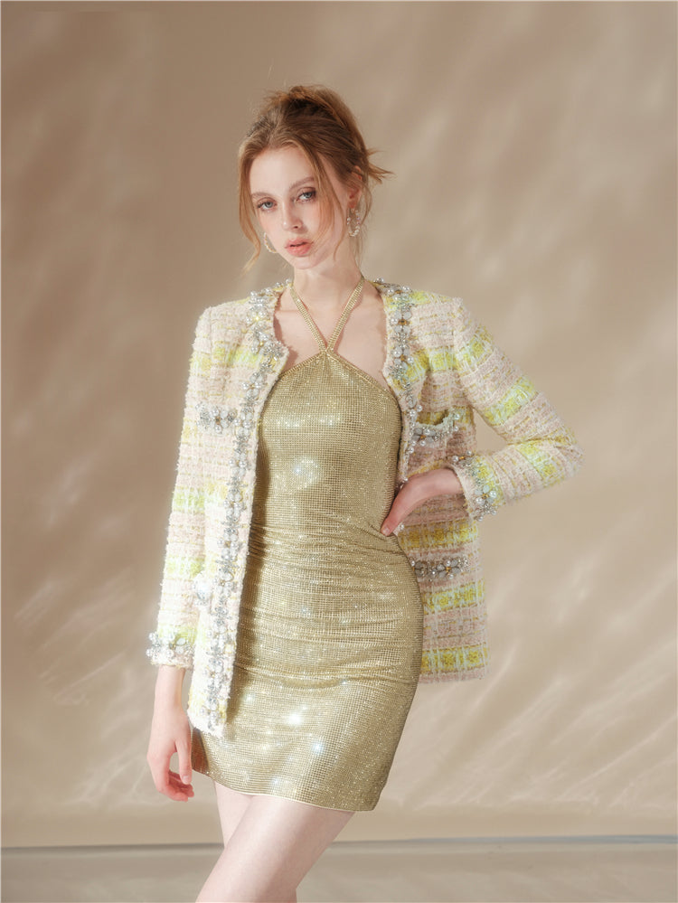 Experience luxury and elegance with our Wardrobes by Chen Elegant Long Sleeve Diamond Short Jacket/Slim Fit Dress. Made from organic materials, this jacket and dress combo not only looks stylish, but also benefits the environment. Stay fashion-forward while making a positive impact with our premium, eco-friendly product.