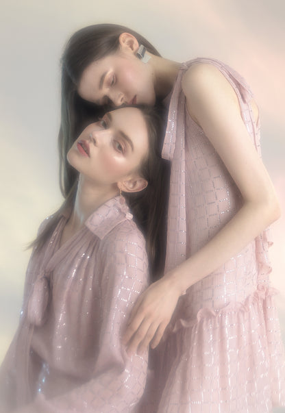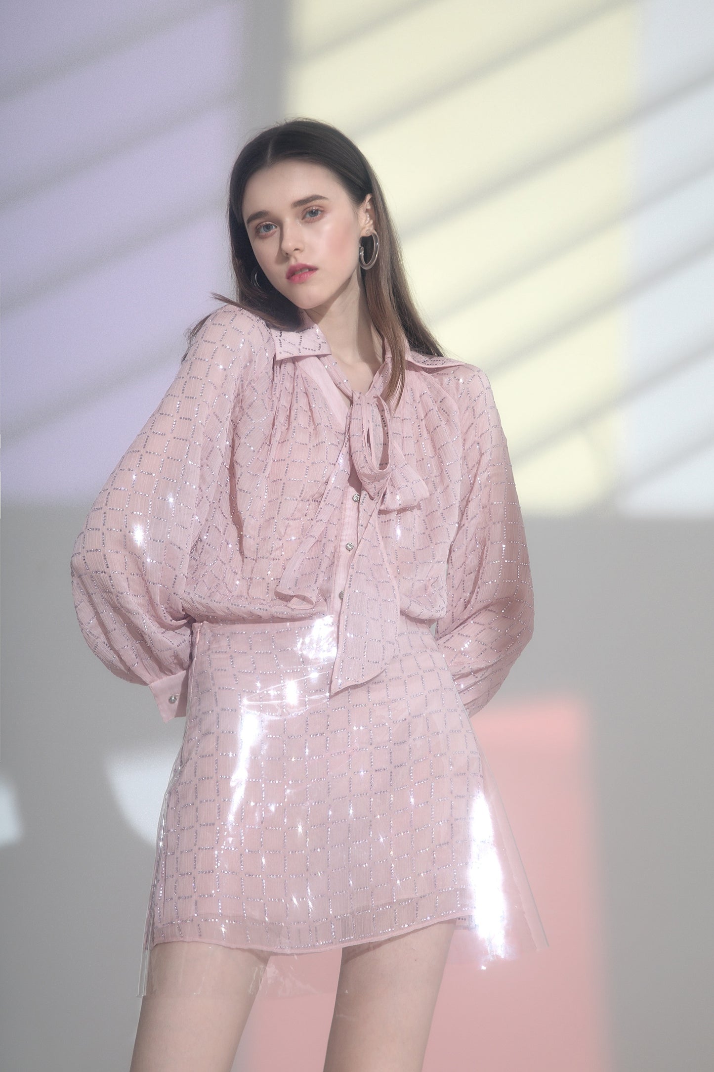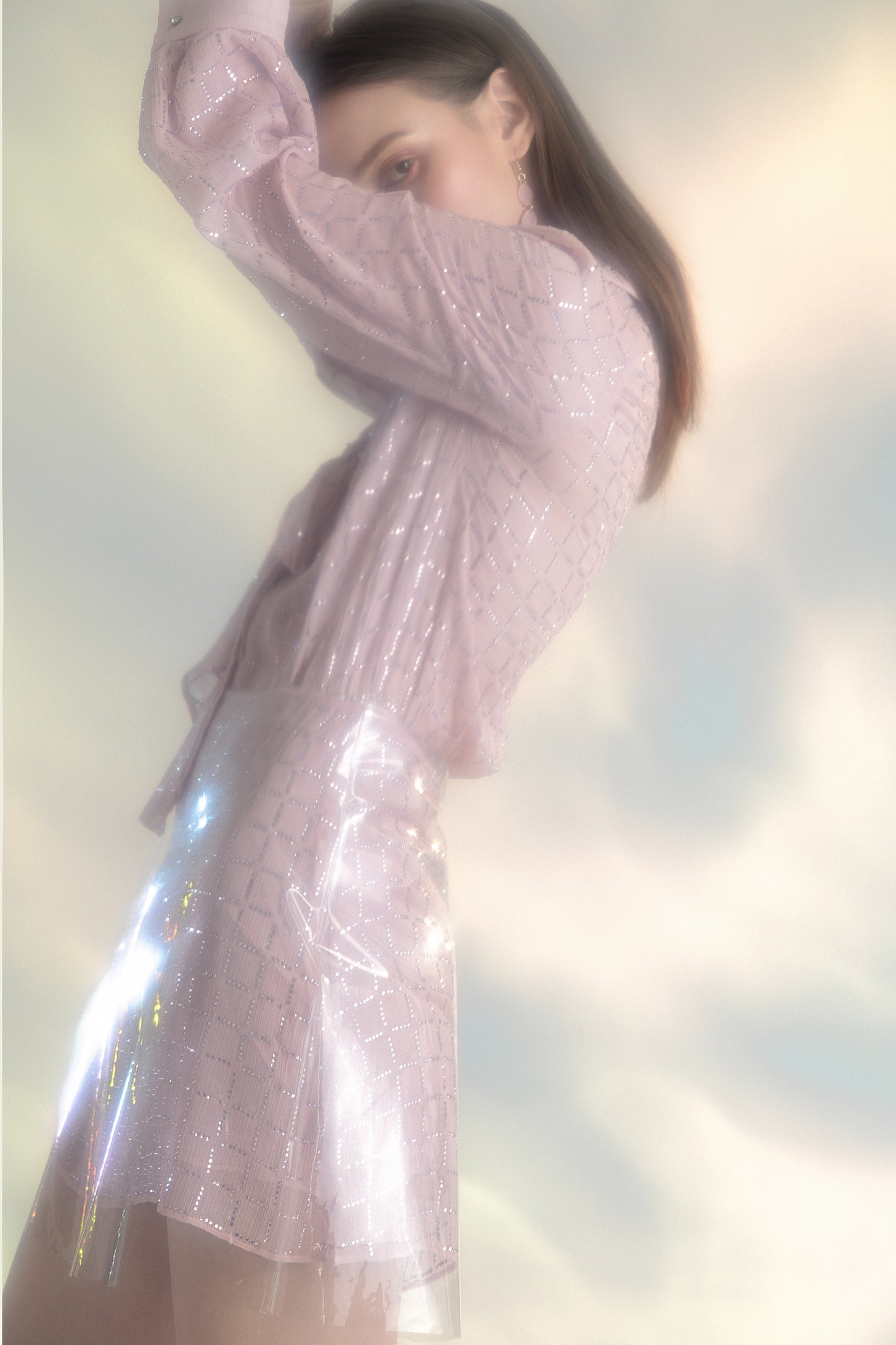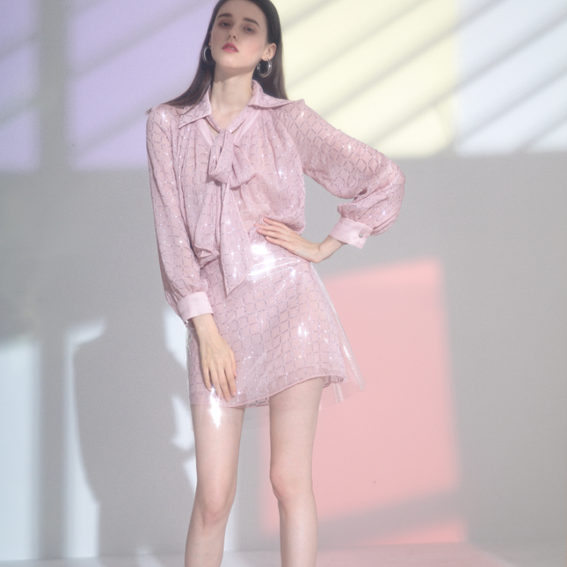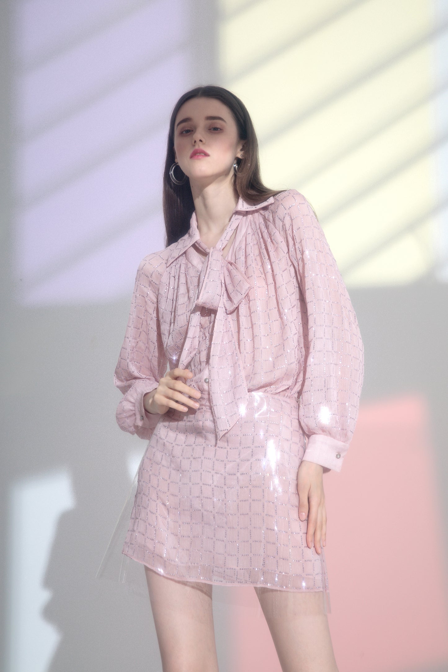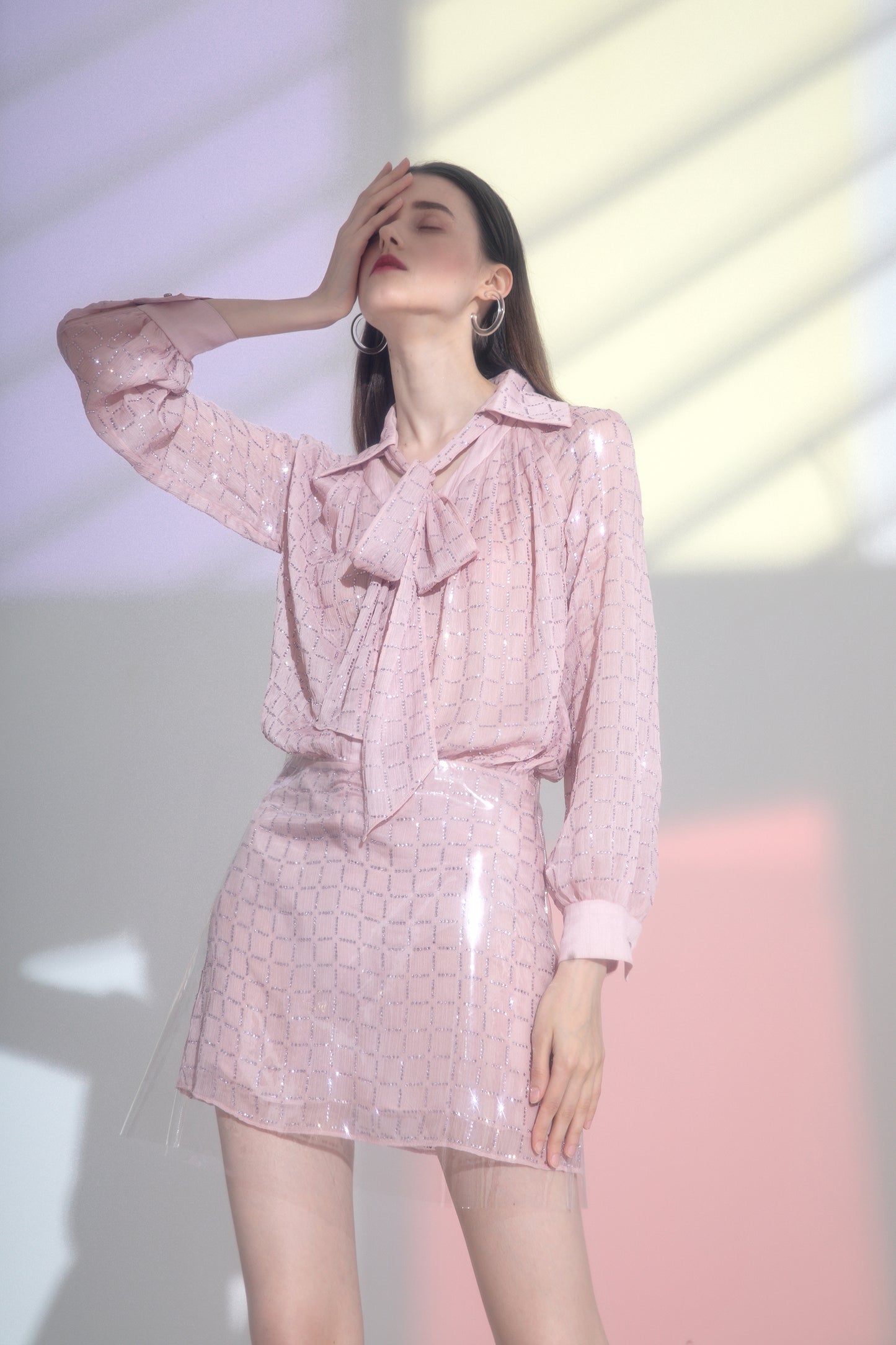 Wardrobes by Chen Elegant Pink Long Sleeve Lace Shirt/Short Skirt-Cass