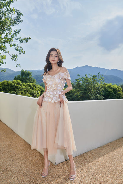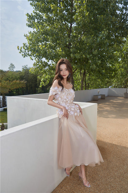 Wardrobes by Chen Elegant Short Sleeve Flower Embroidered midi tulle Dress-Vickie