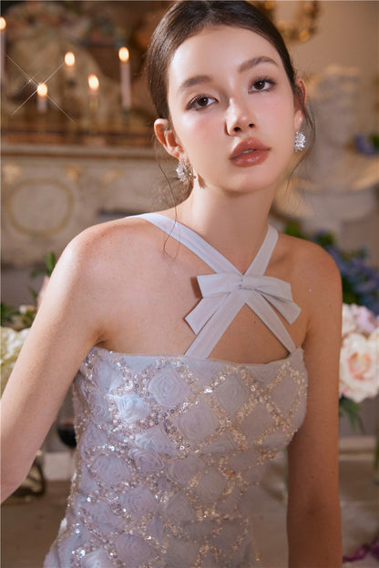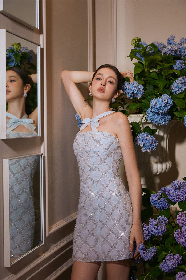 Wardrobes by Chen Elegant pastel Blue Beaded Sequin Butterfly Halter Dress- Gina