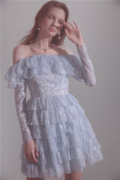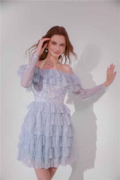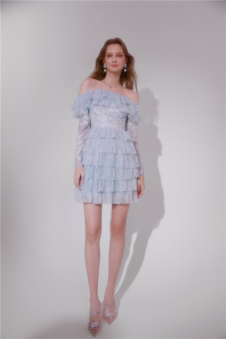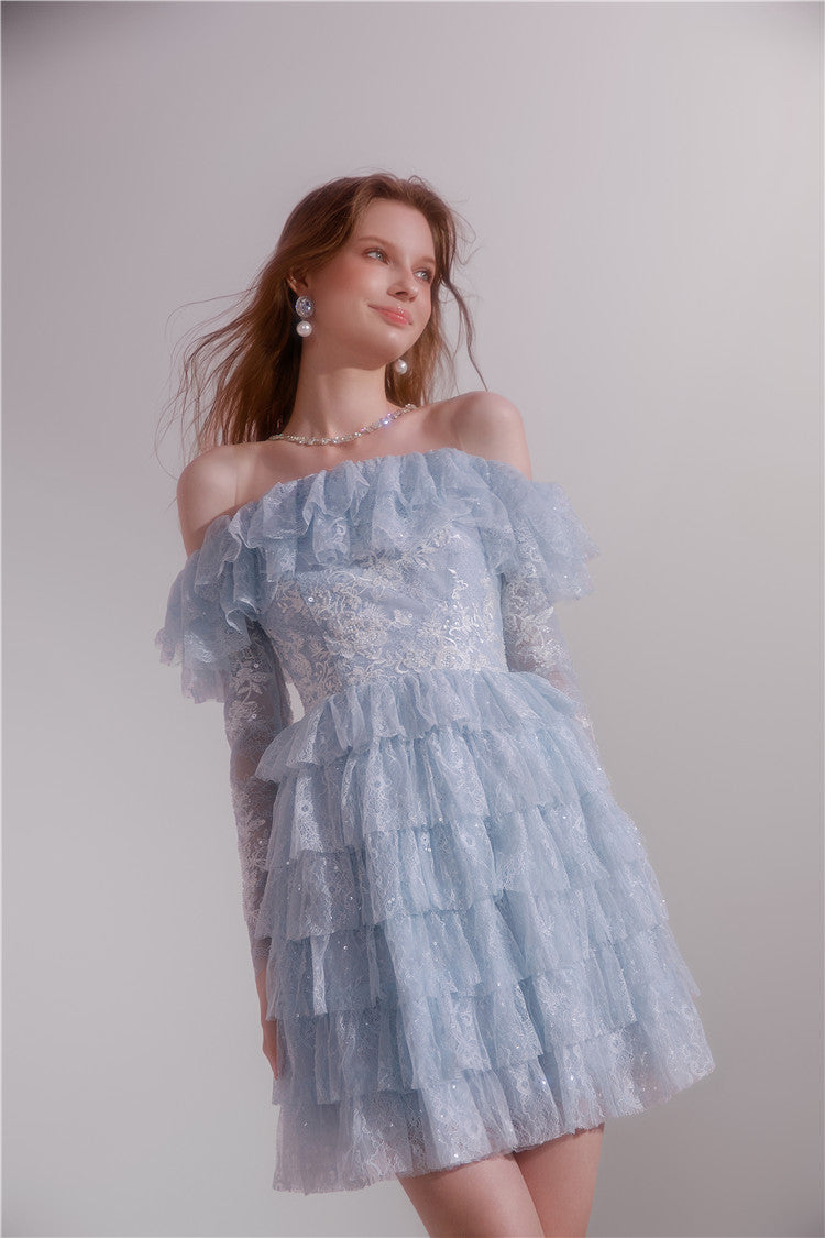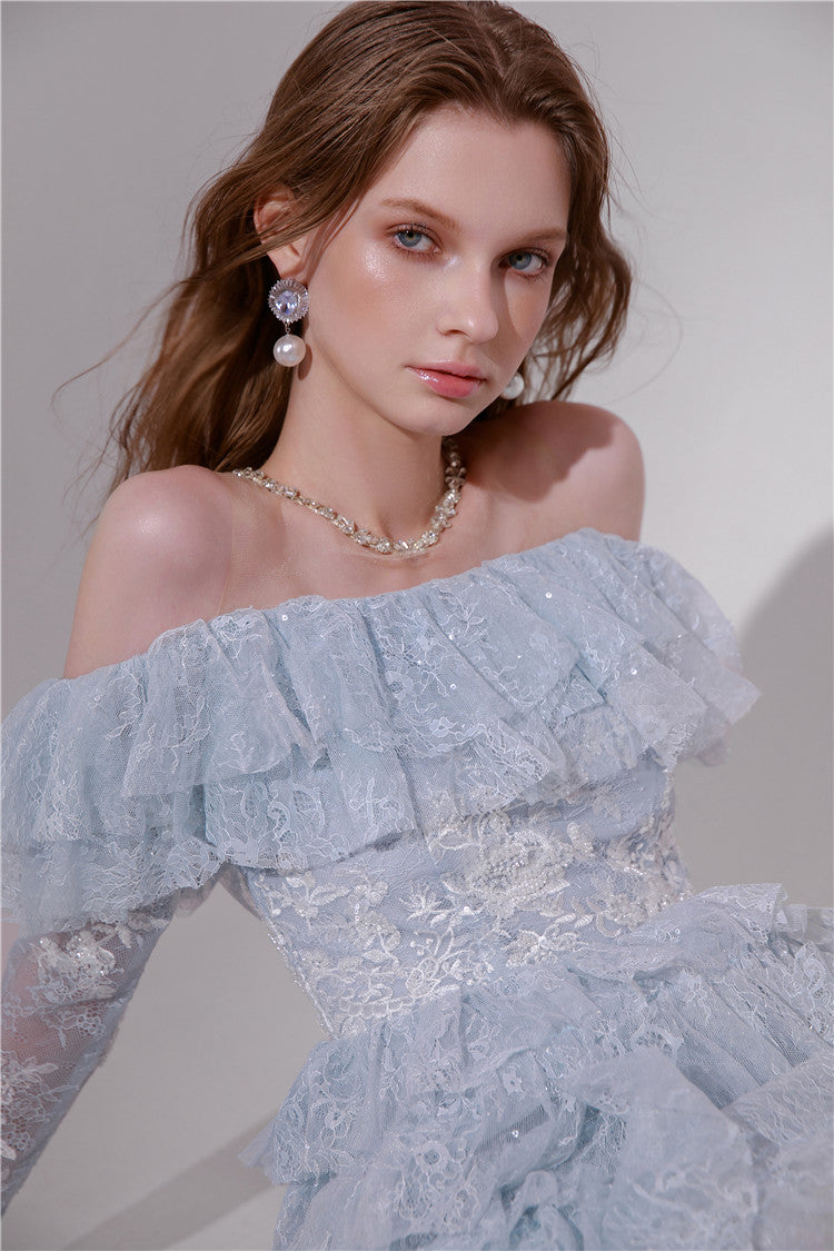 Wardrobes by Chen Blue off shoulder long sleeve Ruffle layer lace Dress-Vee