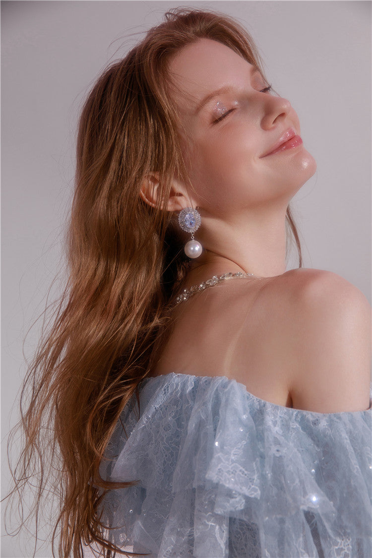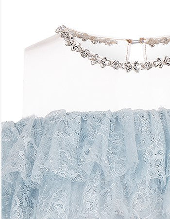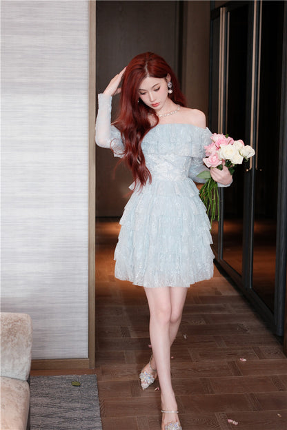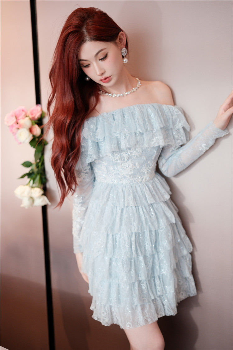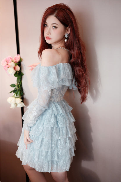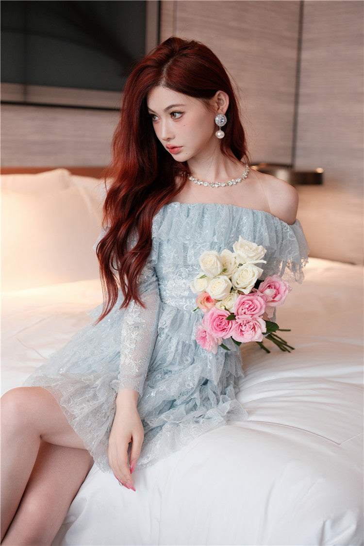 Wardrobes by Chen Blue off shoulder long sleeve Ruffle layer lace Dress-Vee