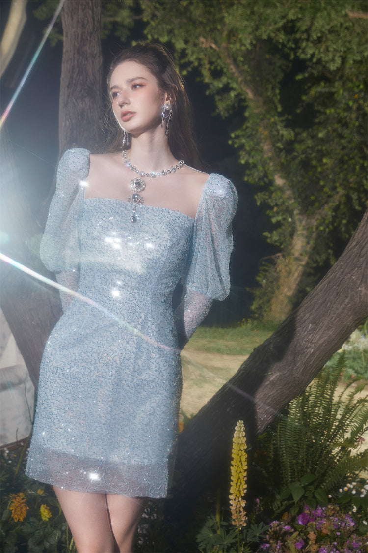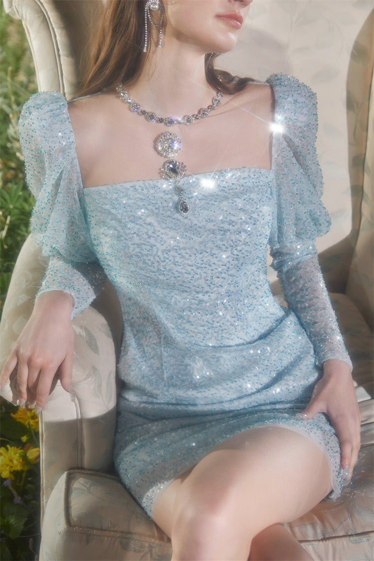 Wardrobes by Chen High End Blue Square Collar Long Sleeve Diamond Dress-Hale