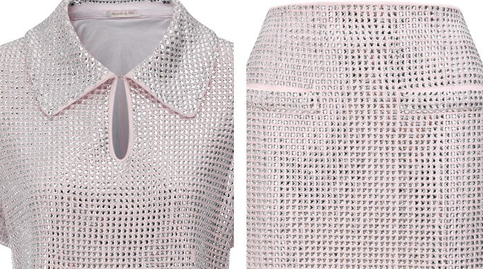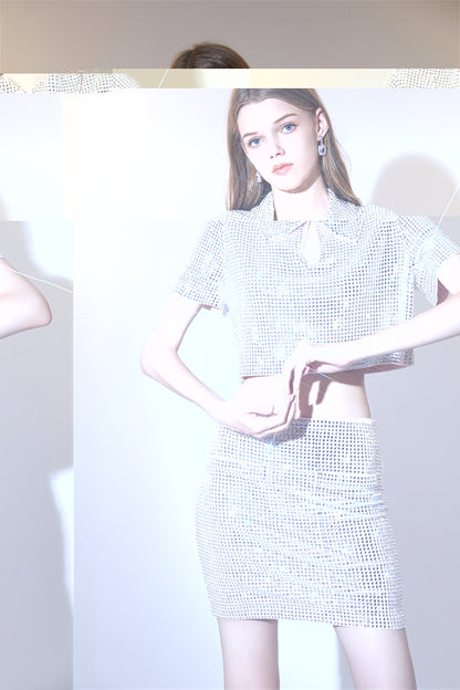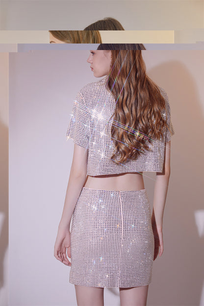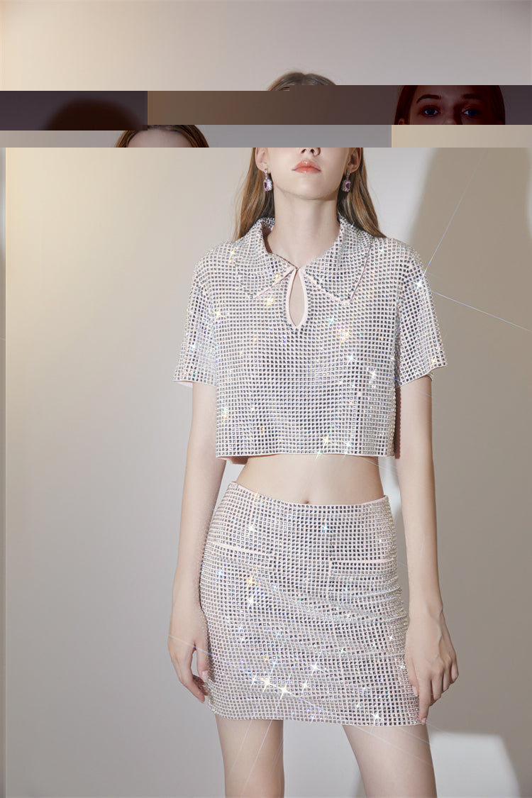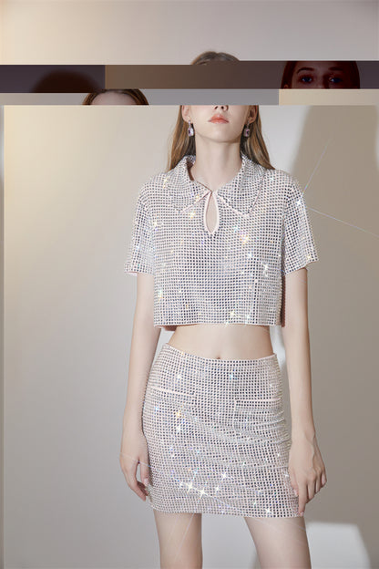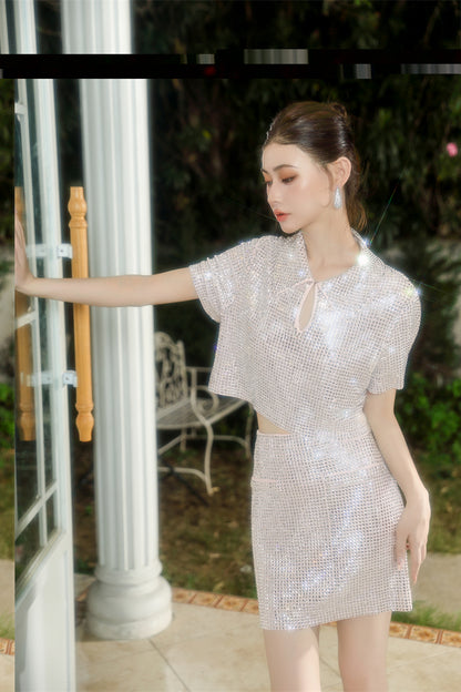 Wardrobes by Chen sequin Lilac Shorts Sleeve Crop Top + Short Skirt-JUICY