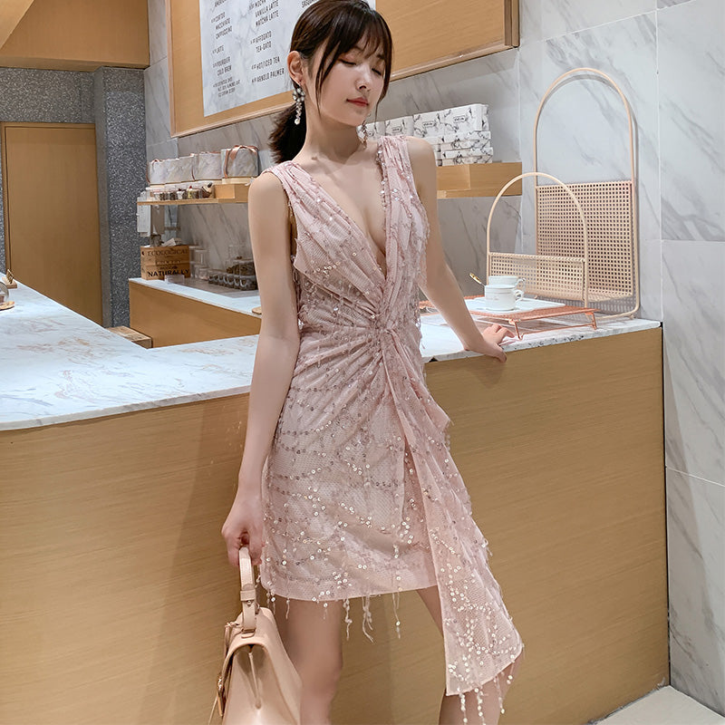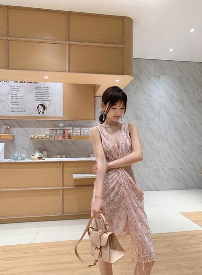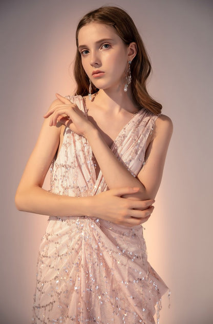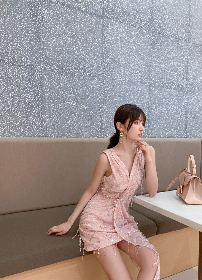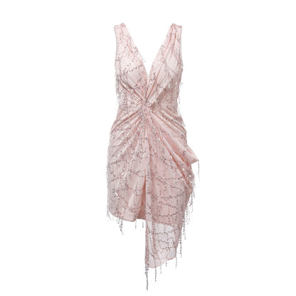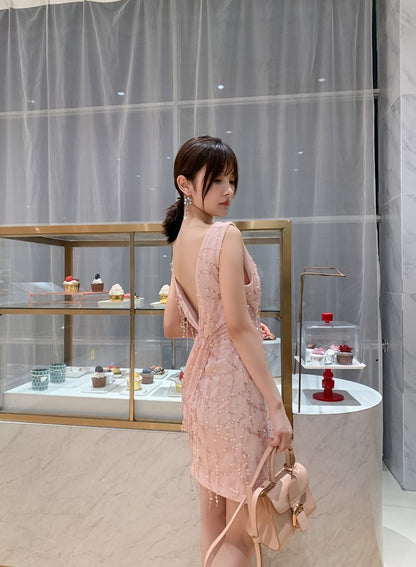 Wardrobes by Chen High End Pink Deep V-Neck Sleeveless Beaded Tassel Dress-Diana