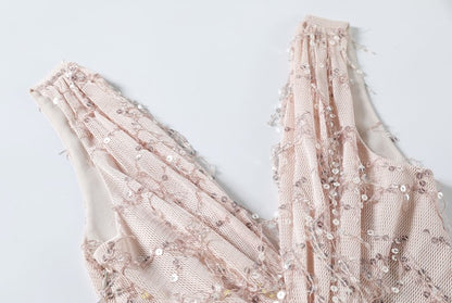 Introducing our Wardrobes by Chen High End Pink Deep V-Neck Sleeveless Beaded Tassel Dress-Diana. This stunning dress features intricate beadwork and elegant tassels, perfect for making a statement at any event. Its gorgeous cut and lovely color will make you the center of attention. Elevate your style with this luxurious dress.