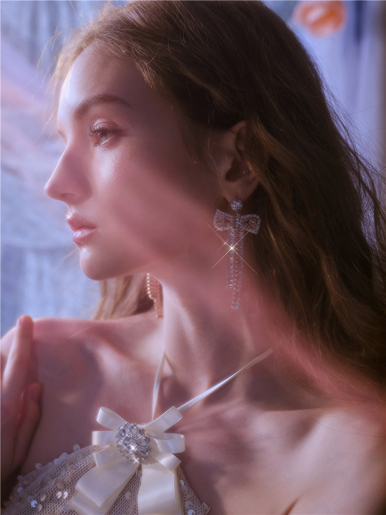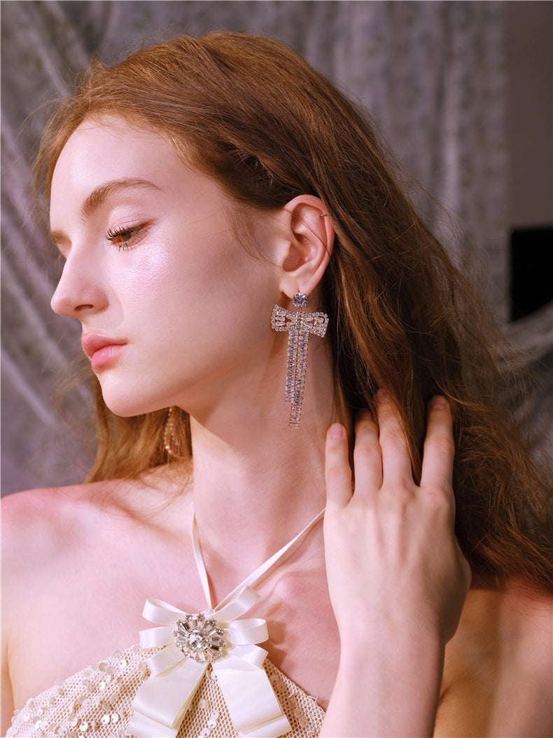 Indulge in ultimate luxury with our Wardrobes by Chen earrings. Crafted with exquisite attention to detail, these Bow Irregular Tassel Full Diamond Earrings exude sophistication and elegance. Let the beautiful design and sparkling diamonds complete every outfit with a touch of glamour.