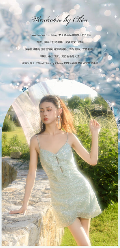 Introducing the signature Bow Sequin Sleeveless Sling Short Dress from our exclusive Wardrobes by Chen Luxury collection. With its sophisticated and classy design, this dress exudes elegance and luxury. Make a statement at any event with this beautifully crafted piece.