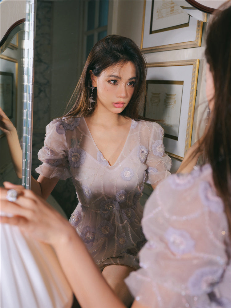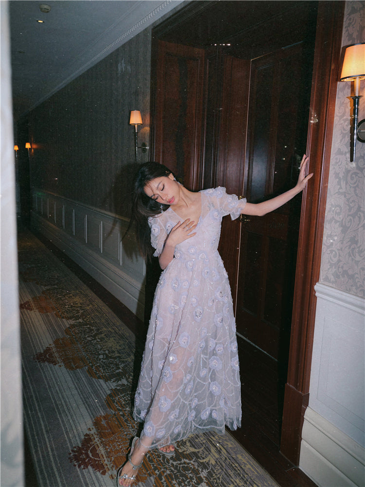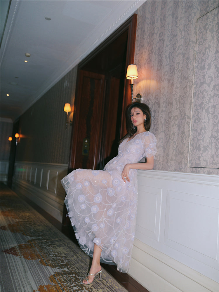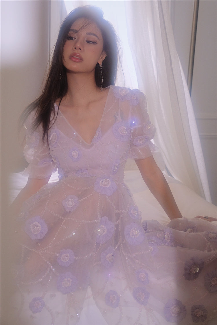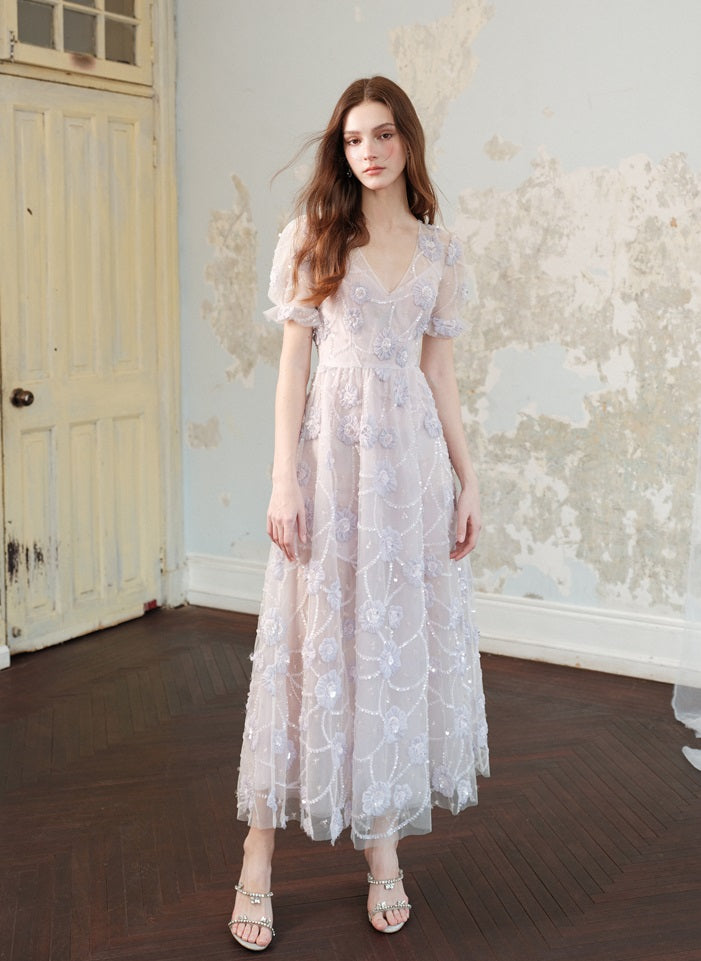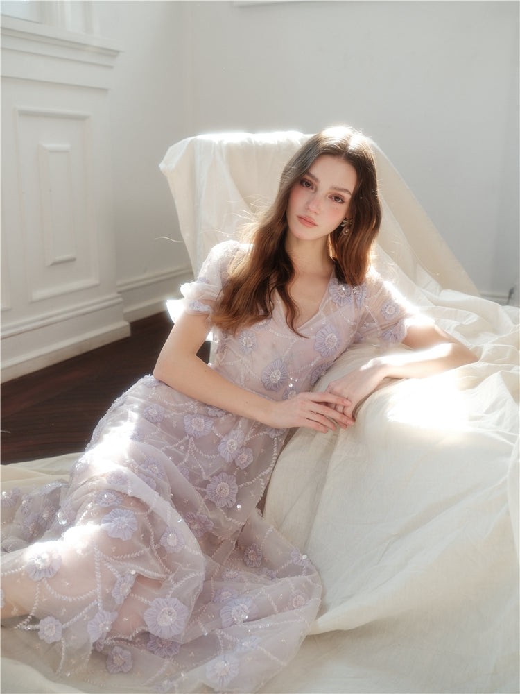 Indulge in luxury with our Wardrobes by Chen Lavender Dress. The beautiful v-neck and puff sleeves create an elegant silhouette, while the intricate embroidery adds a touch of sophistication. Make a statement at any event with this exclusive and glamorous piece.