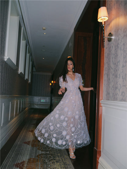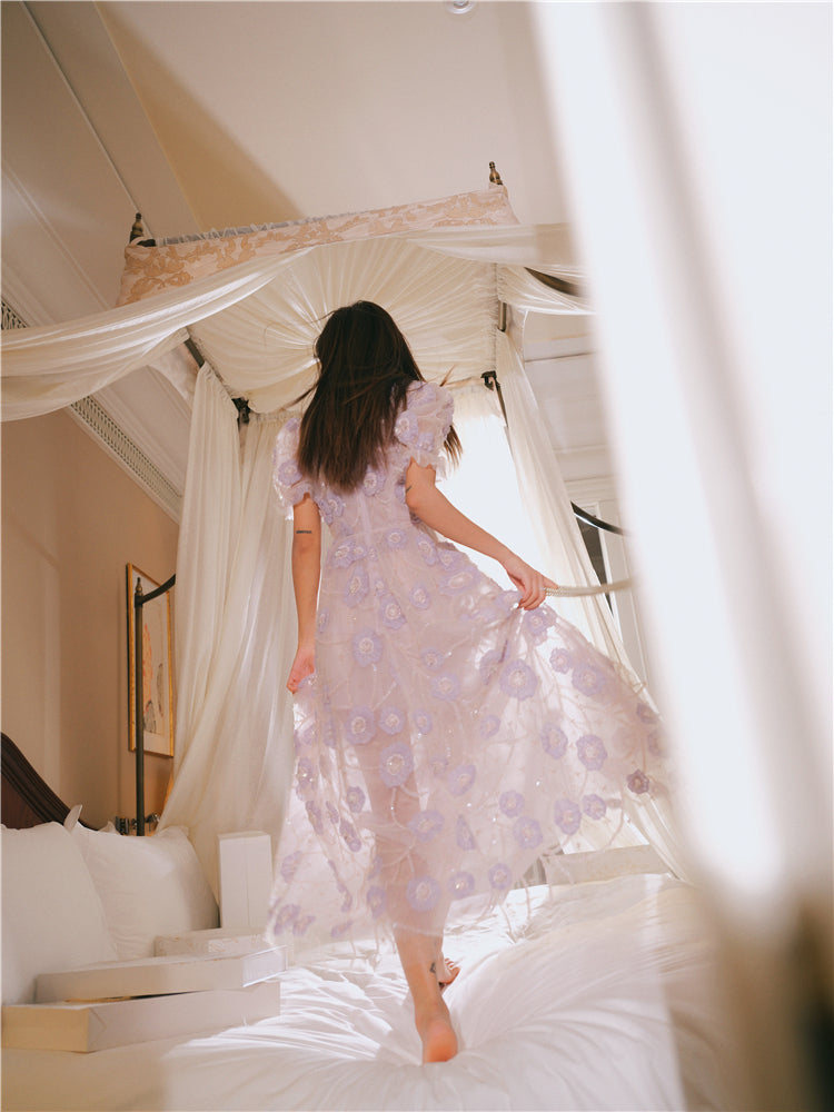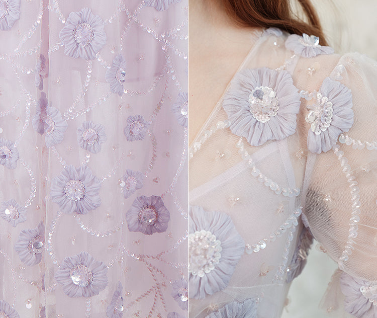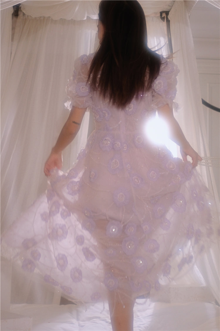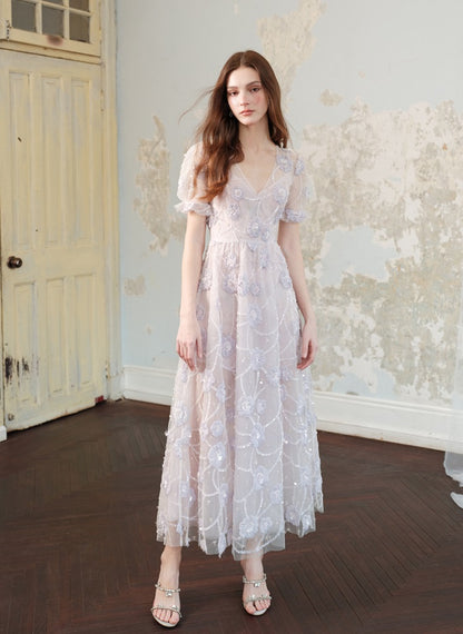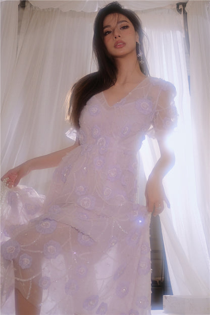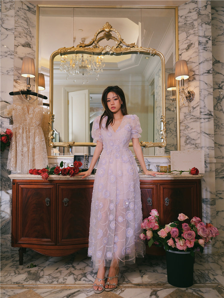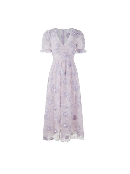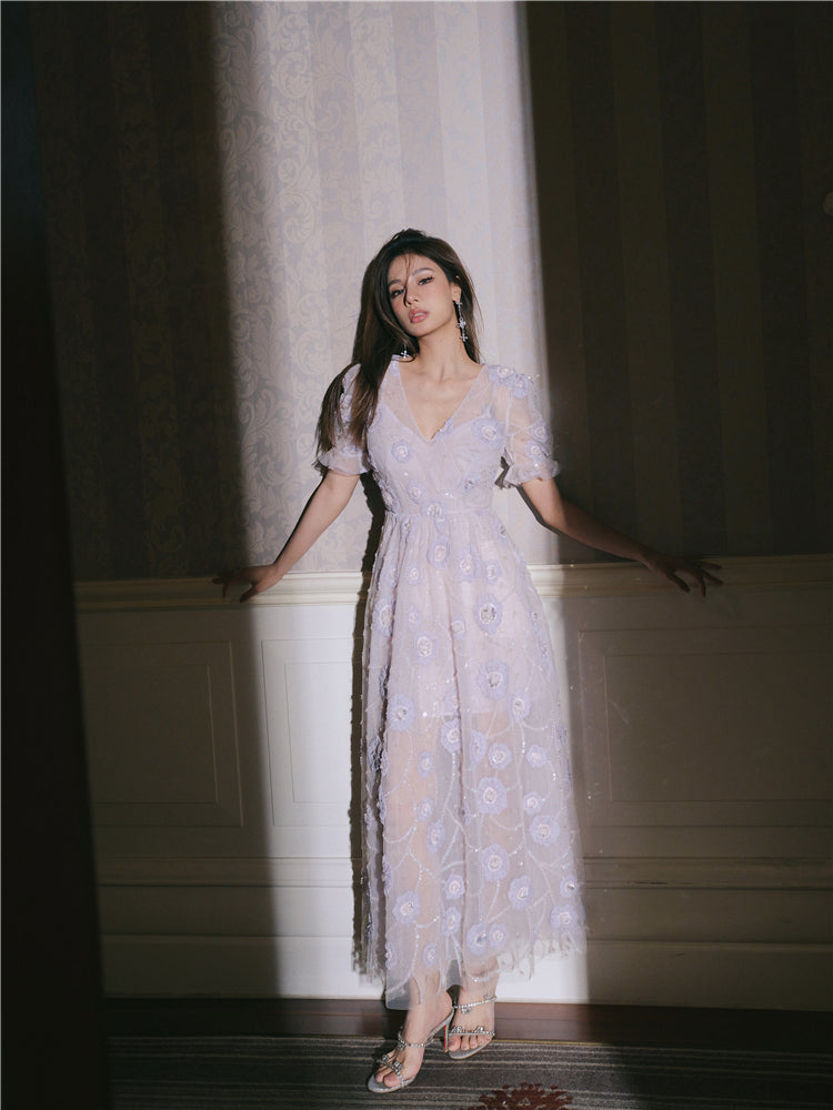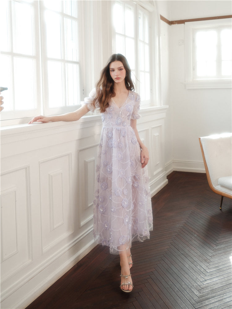 Wardrobes by Chen Luxury Lavender V-Neck Puff Sleeves Embroidered midi Dress-Spark