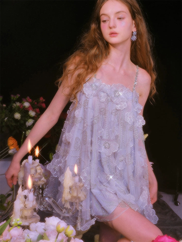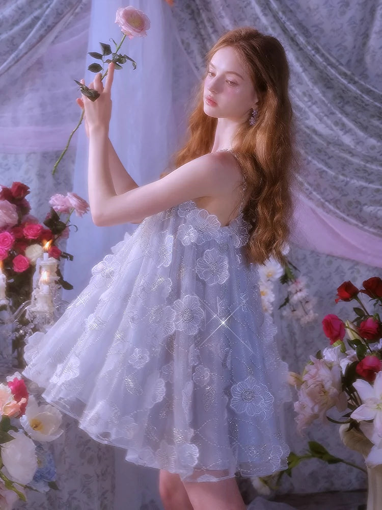 Wardrobes by Chen Luxury Light Blue Sleeveless Flower Diamond Short Doll Dress-Tutu