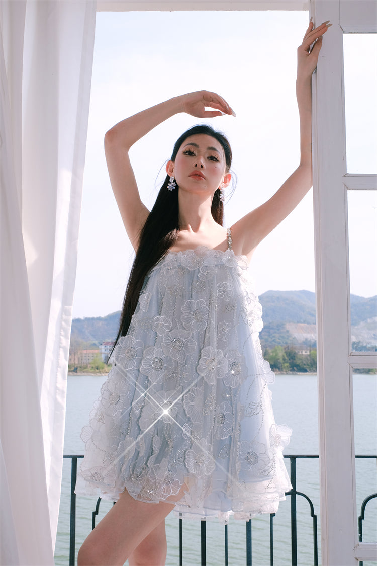 This exquisite dress from Wardrobes by Chen is the epitome of chic and lovely. With its light blue color, sleeveless design, and charming flower diamond details, this dress is perfect for any occasion. Feel like a precious gem in this luxurious tutu dress.