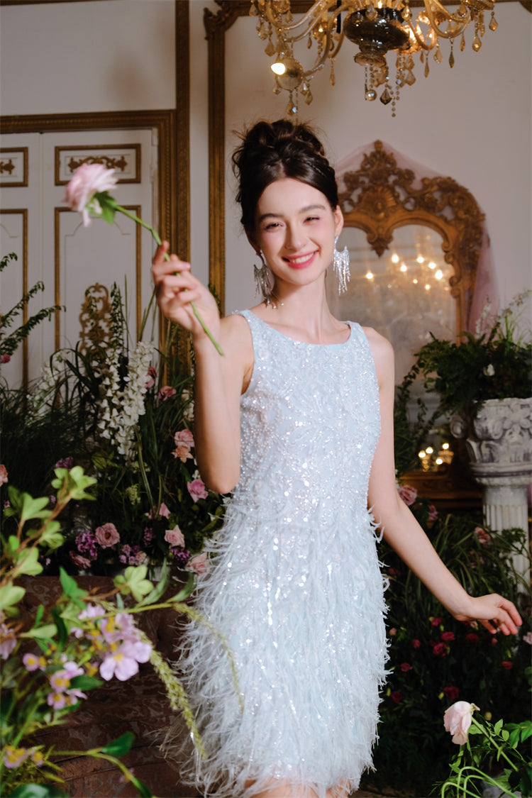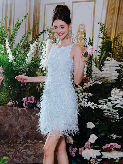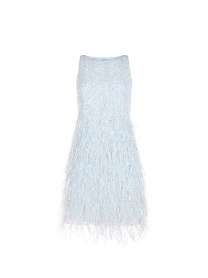 Wardrobes by Chen Luxury pastel Blue Sleeveless Tassel Feather Dress - Bjimi