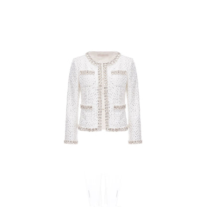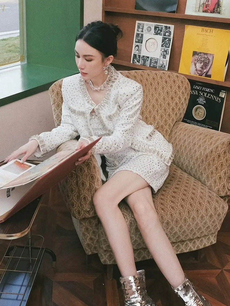 This stunning Wardrobes by Chen jacket/dress combo exudes elegance and sophistication. The luxurious white fabric paired with the long sleeves gives a refined and timeless look. Perfect for social gatherings and special occasions, this versatile piece will elevate your wardrobe to a new level of sophistication.