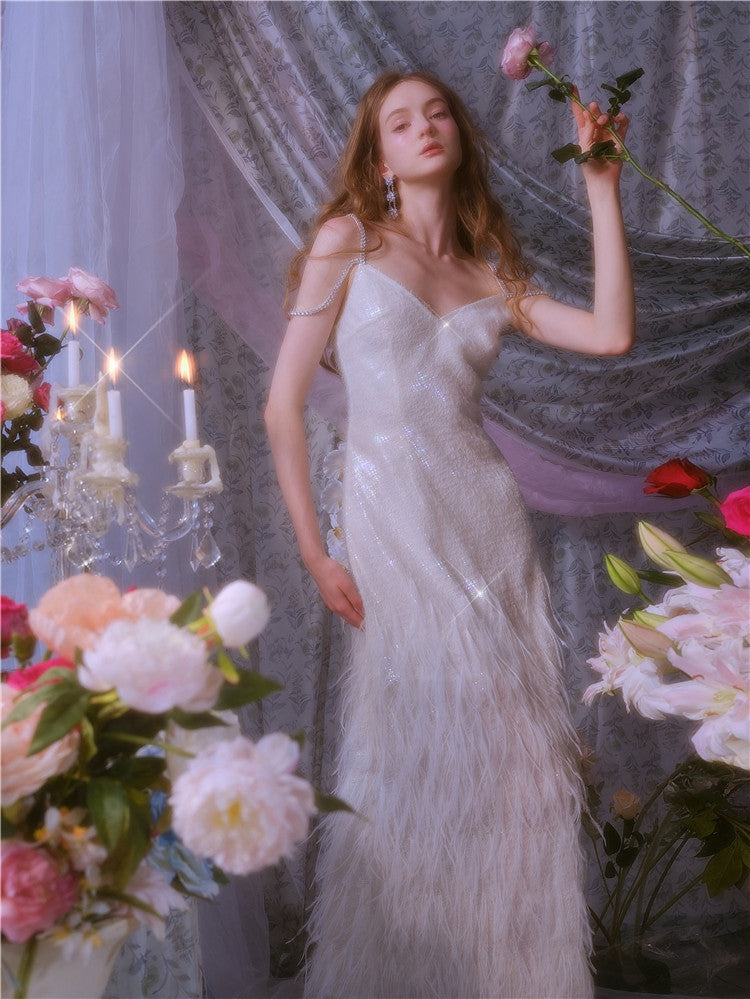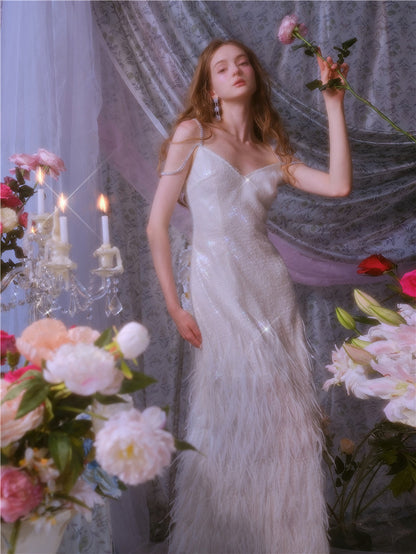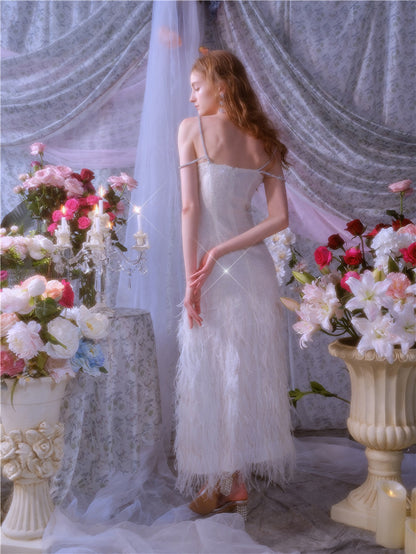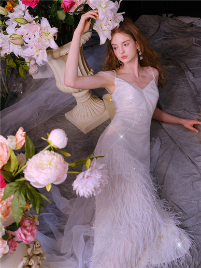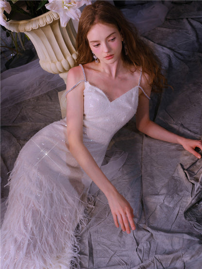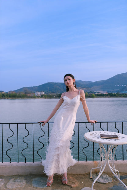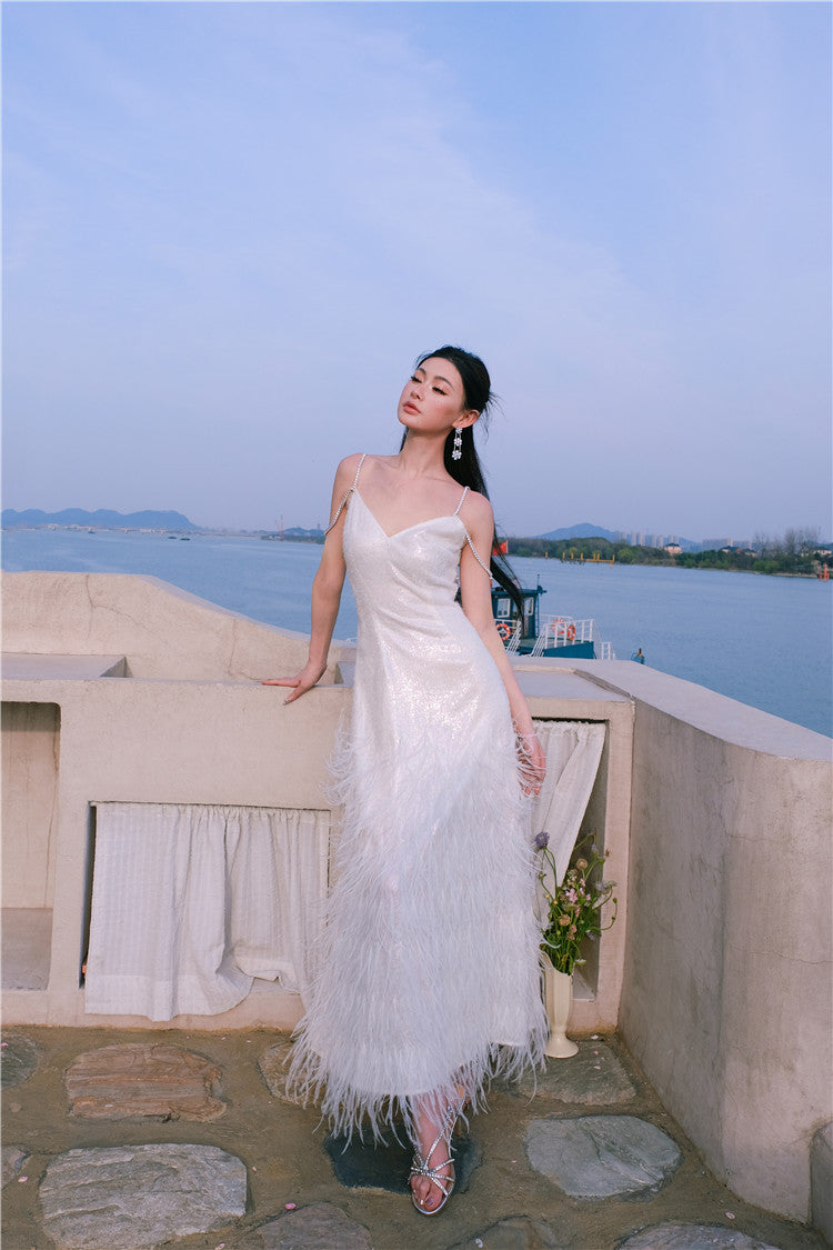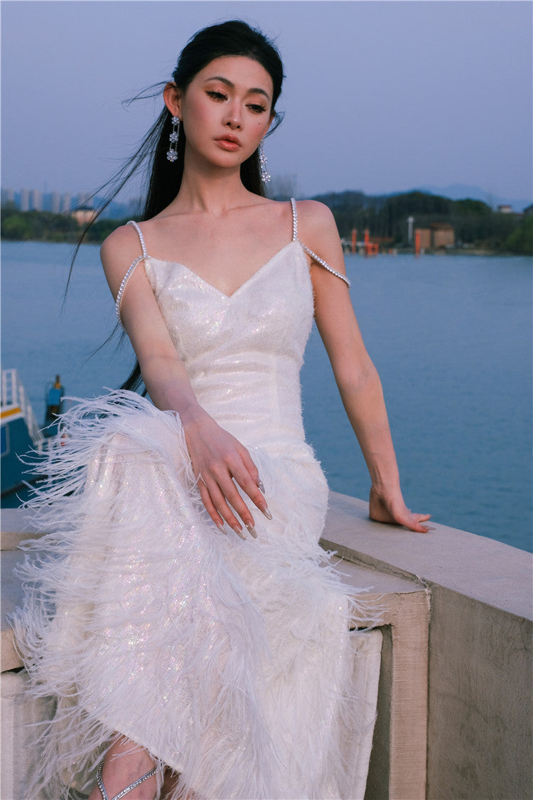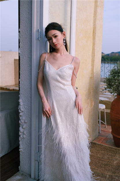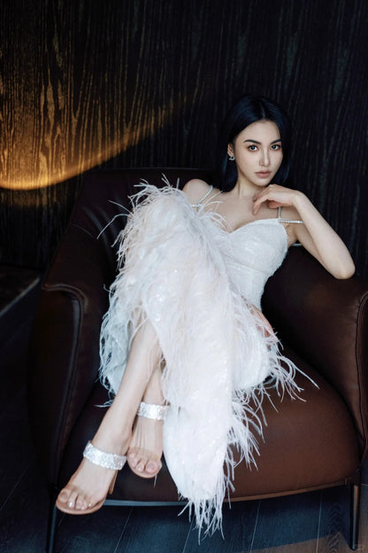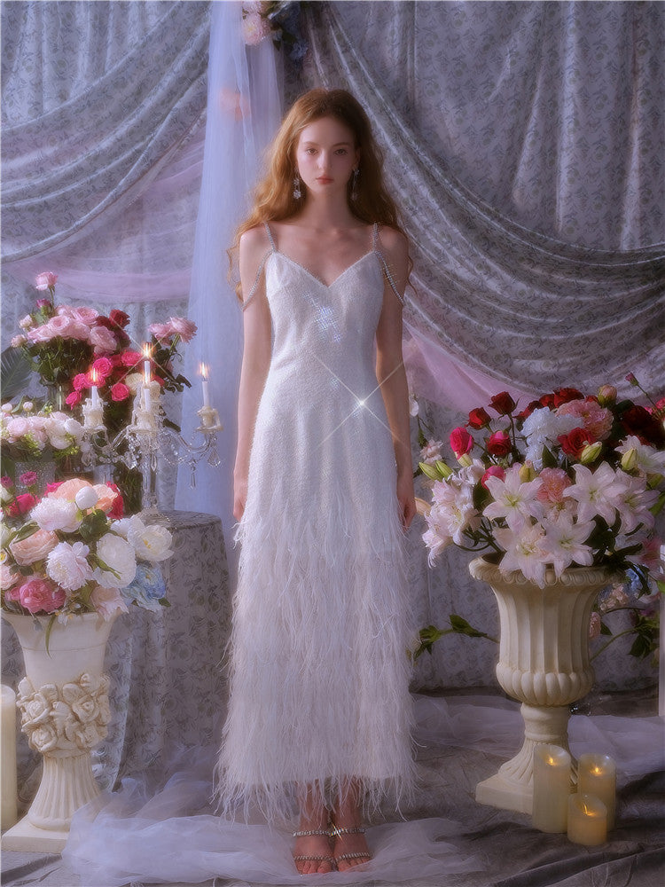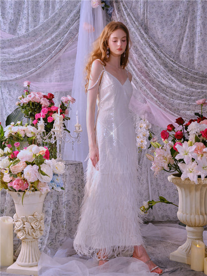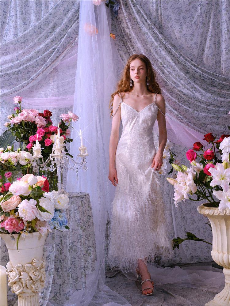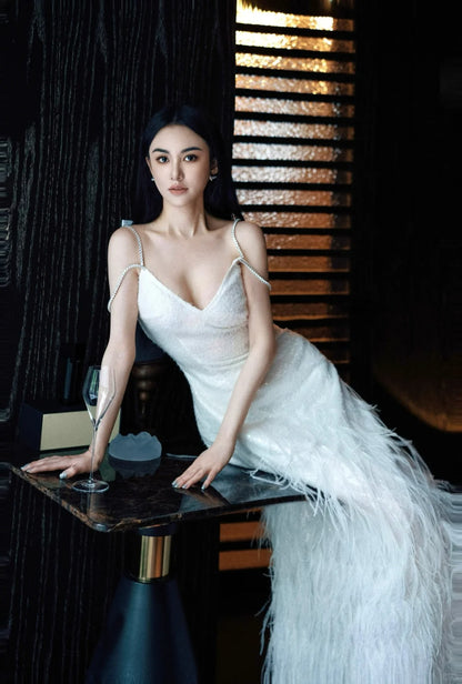 Wardrobes by Chen Luxury White V-Neck Feather Engagement bridal Dress-Destiny