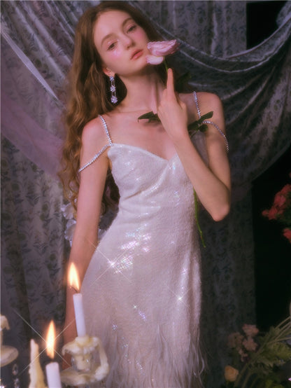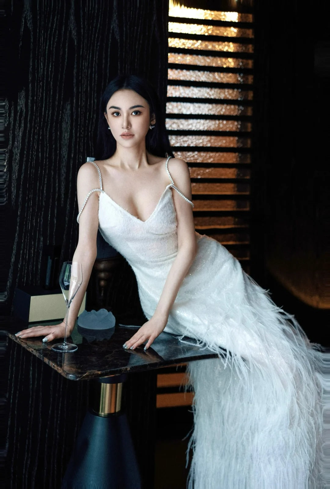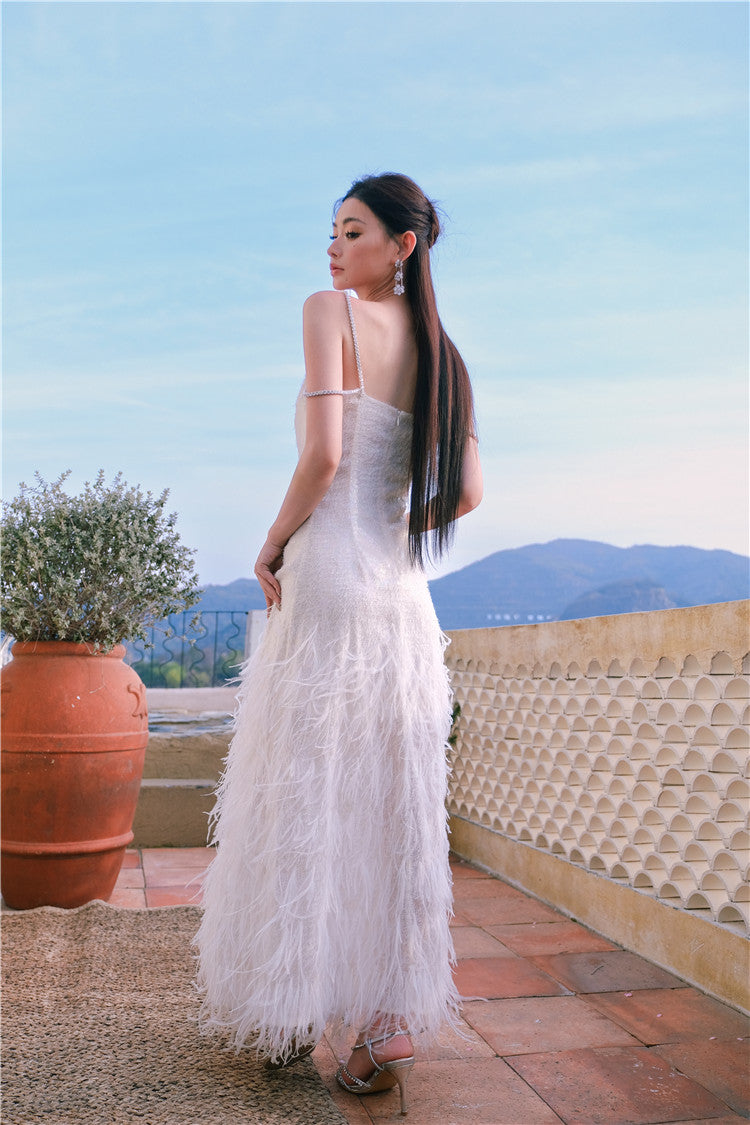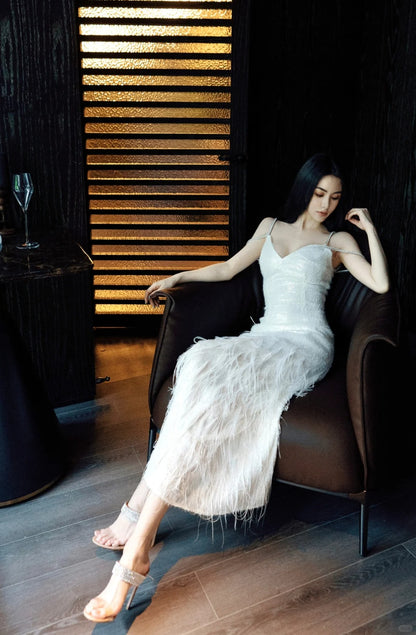 Elevate your style with our Wardrobes by Chen Luxury dress in white. The V-neck design and feather embellishments exude elegance and beauty. Perfect for special occasions, this dress is a must-have in your wardrobe. Stand out in our exquisite and gorgeous Destiny dress.