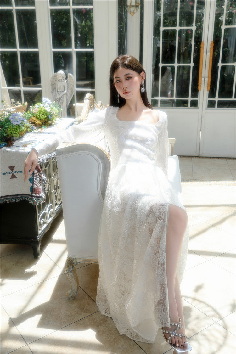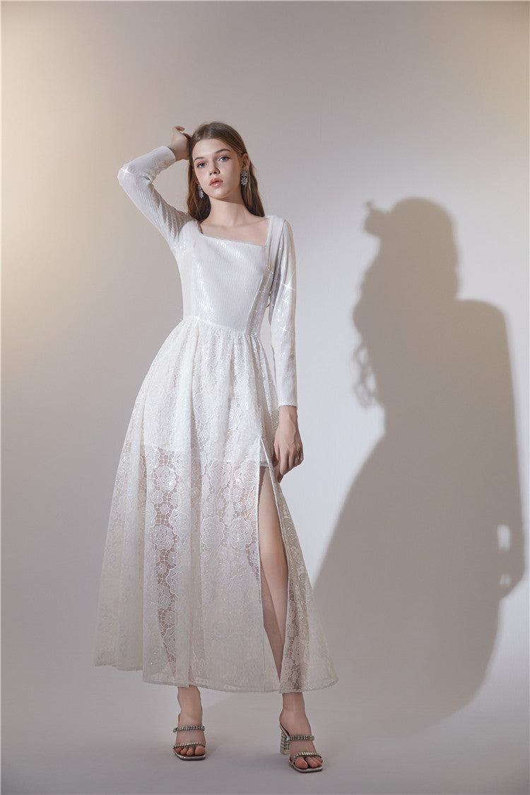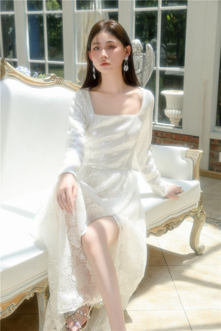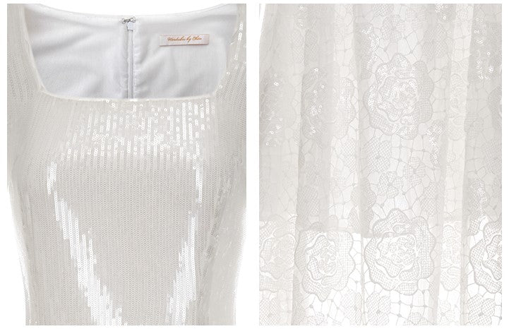 Indulge in the elegance and grace of our Wardrobes by Chen White French Style Sequin Lace Maxi Dress-MORA. This luxurious dress features intricate sequin lace detailing, creating a sophisticated and exclusive look. Perfect for any special occasion, this dress will make you feel like a work of art.