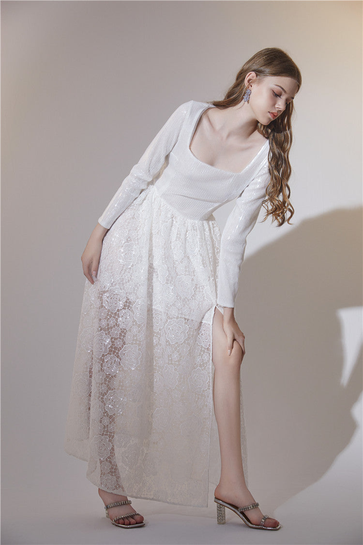 Wardrobes by Chen White French Style Sequin Lace Maxi Dress-Tabitha