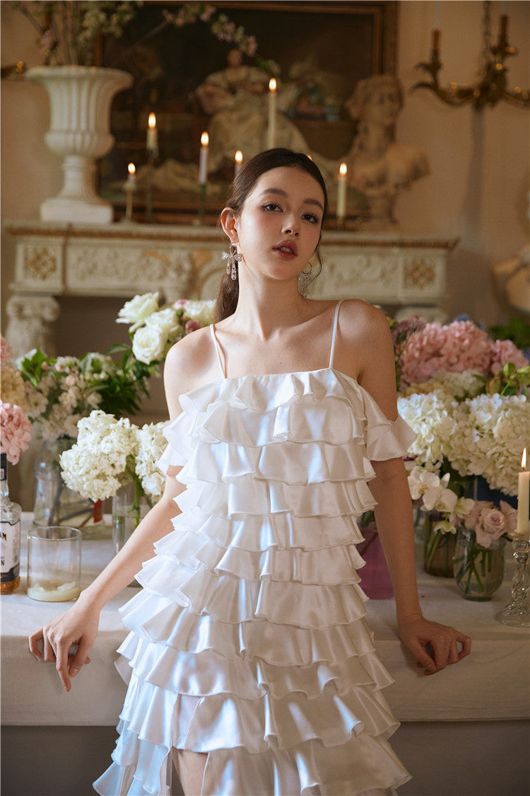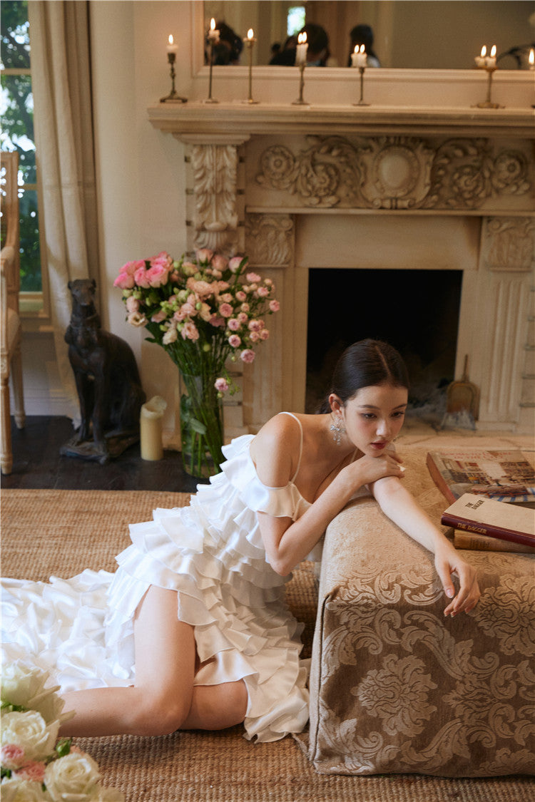 Wardrobes by Chen White Luxury Cake Dress Long Ruffle Slip bridal Dress- Uiiju