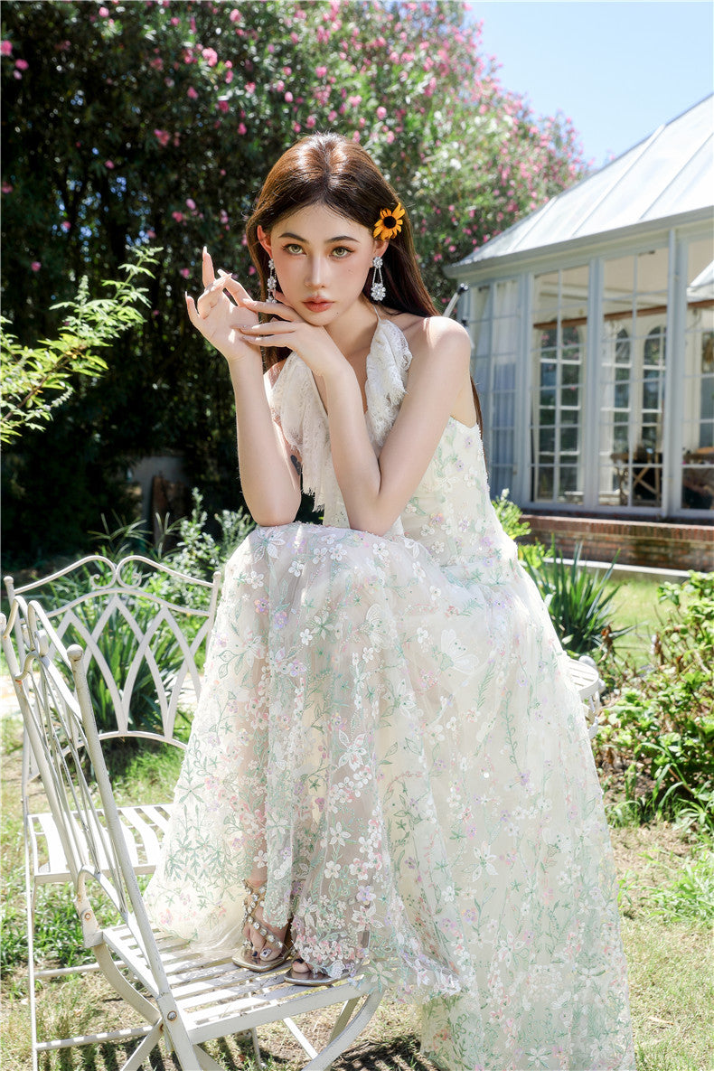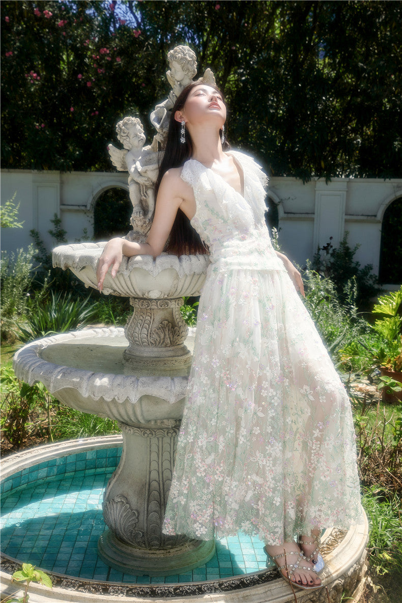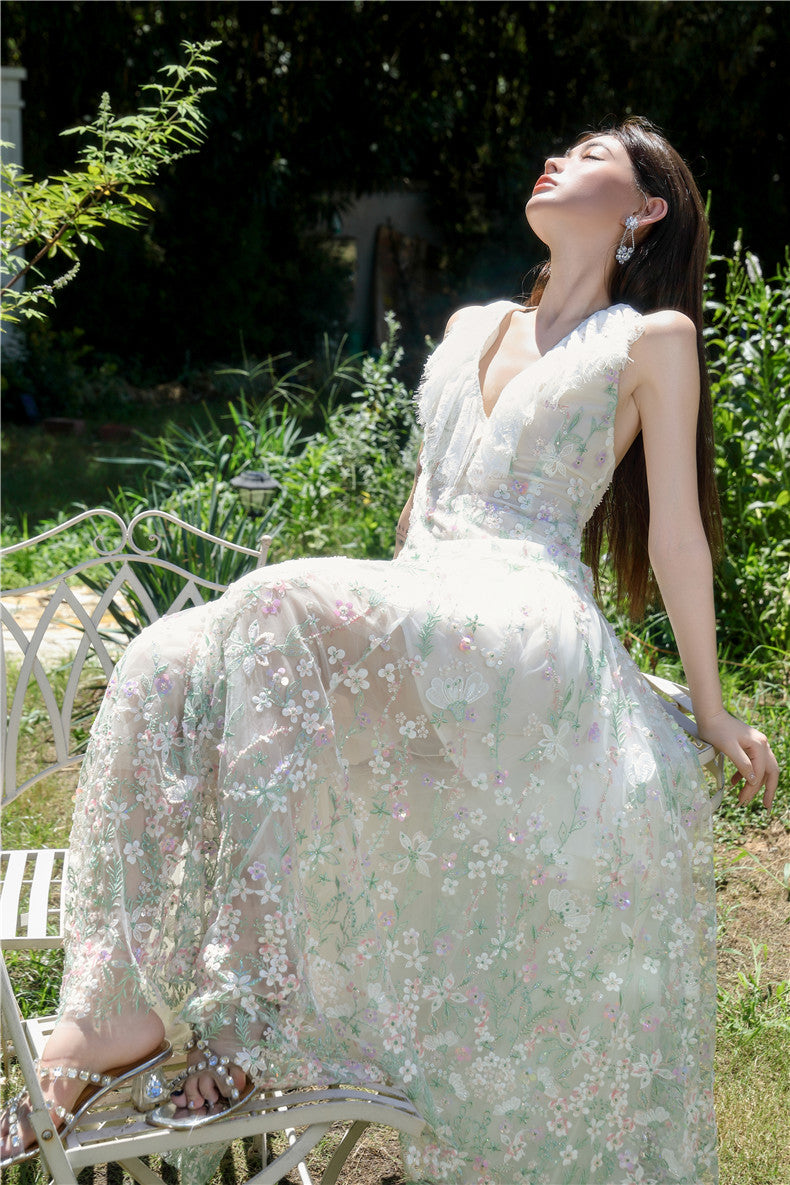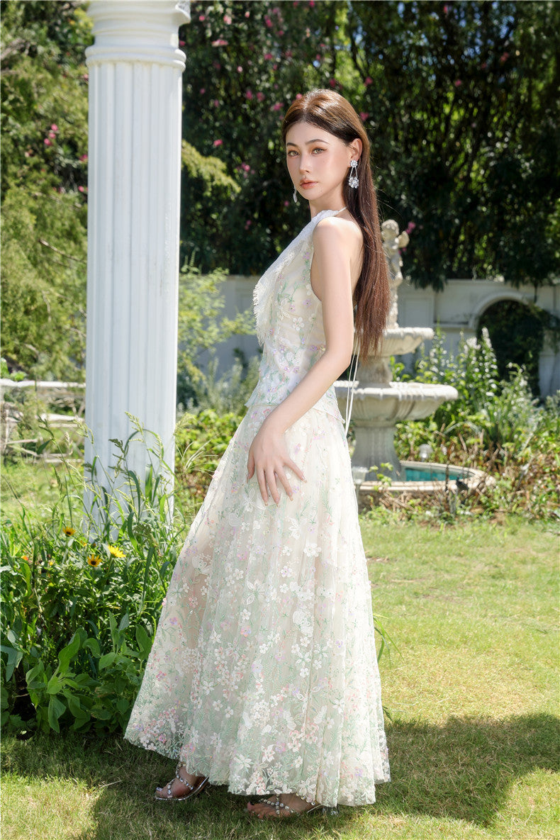 Indulge in luxury with Chen's exquisite Wardrobes long lace dress. This sleeveless piece features delicate flower embroidery and elegant lace, making it a beautiful addition to your wardrobe. Elevate your style and become an EGODI with this tasteful and exclusive dress.