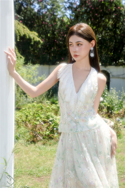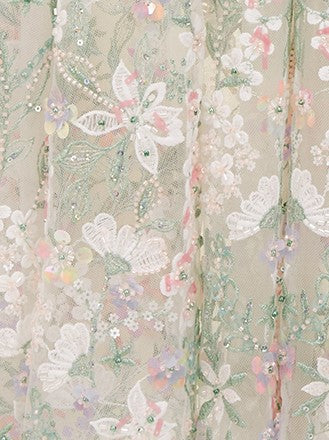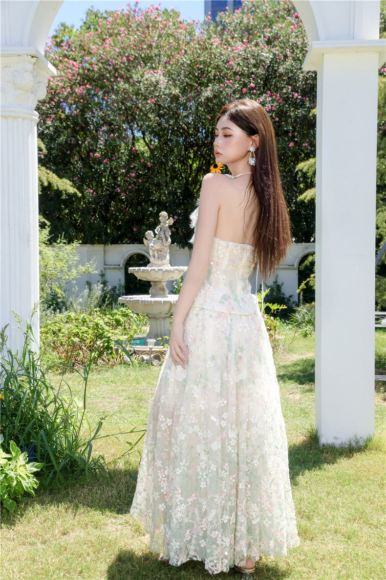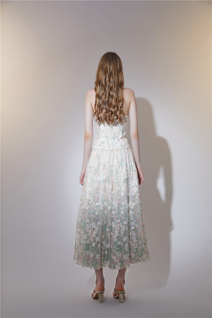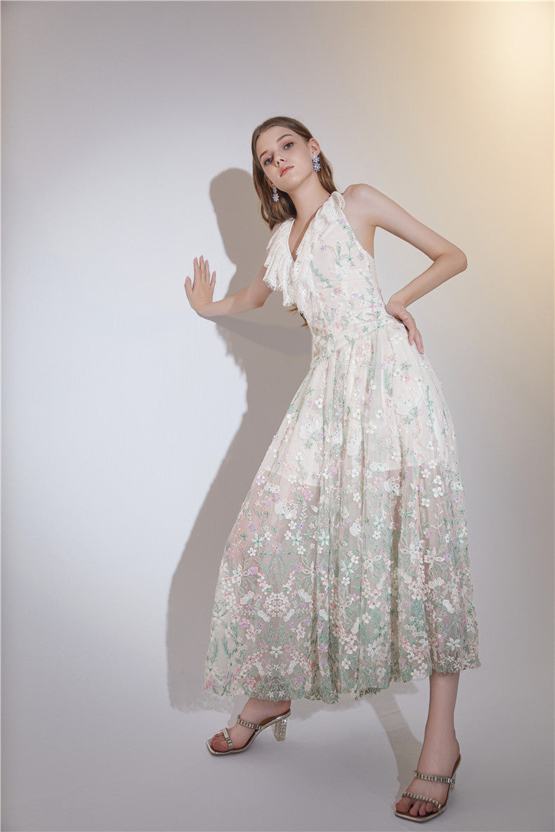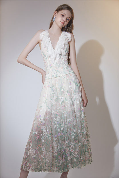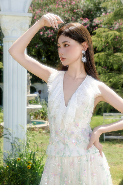 Indulge in luxury with Chen's exquisite Wardrobes long lace dress. This sleeveless piece features delicate flower embroidery and elegant lace, making it a beautiful addition to your wardrobe. Elevate your style and become an EGODI with this tasteful and exclusive dress.