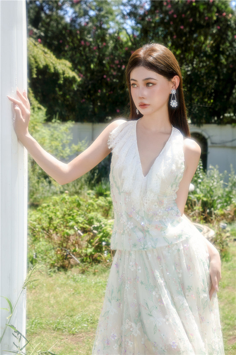 Wardrobes by Chen White Sleeveless Flower Embroidery Long Lace Dress - EGODI