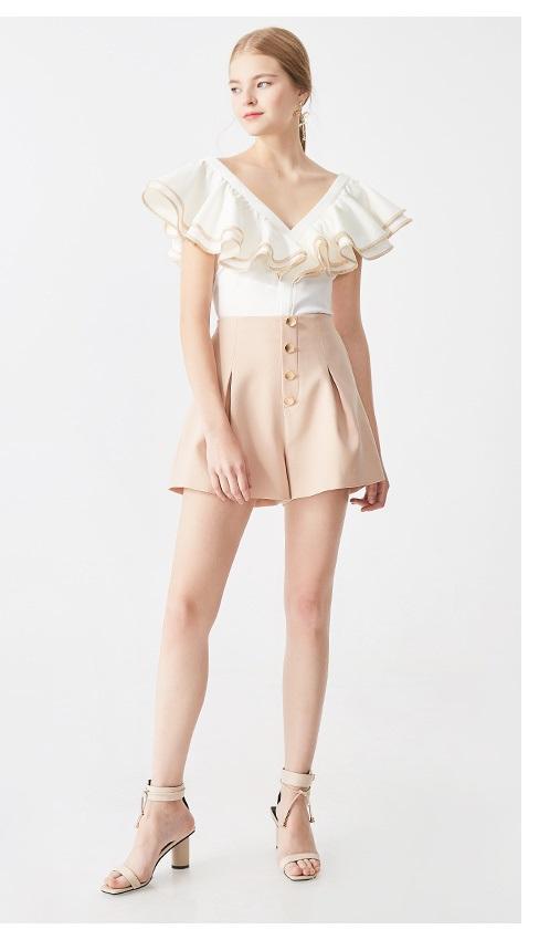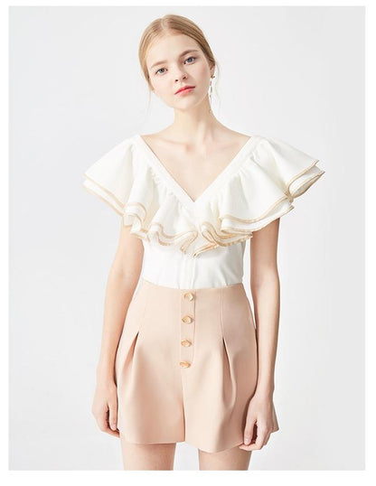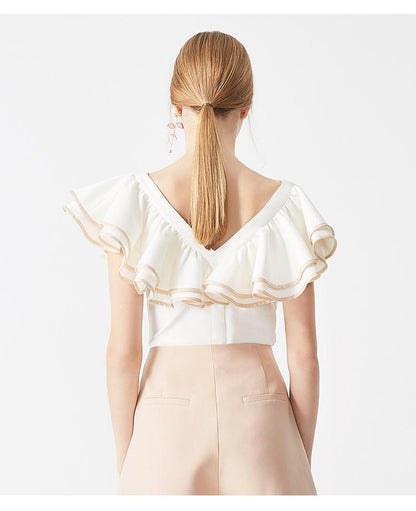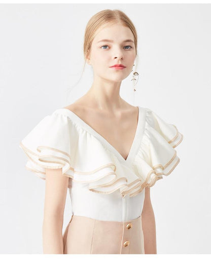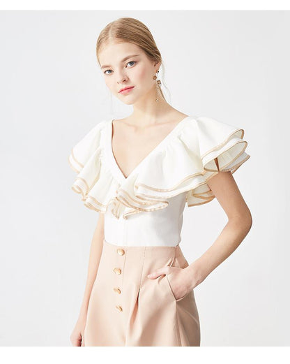 White sweet V-neck thin short ruffled shirt blouse top - Veli