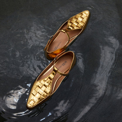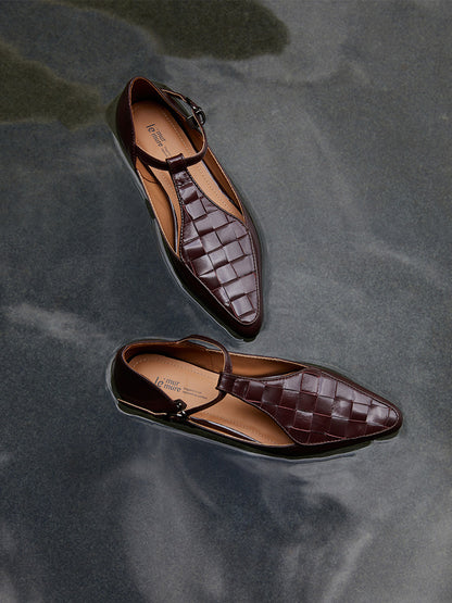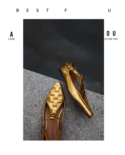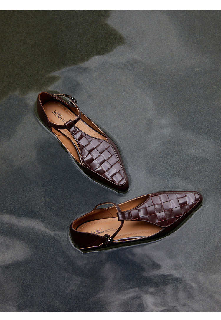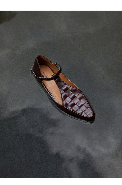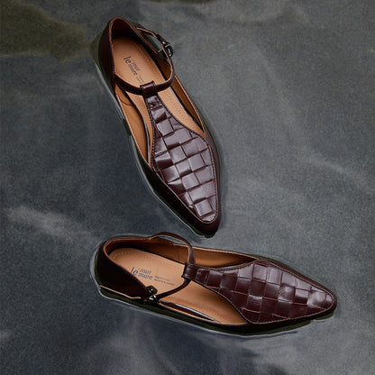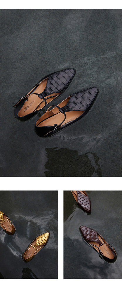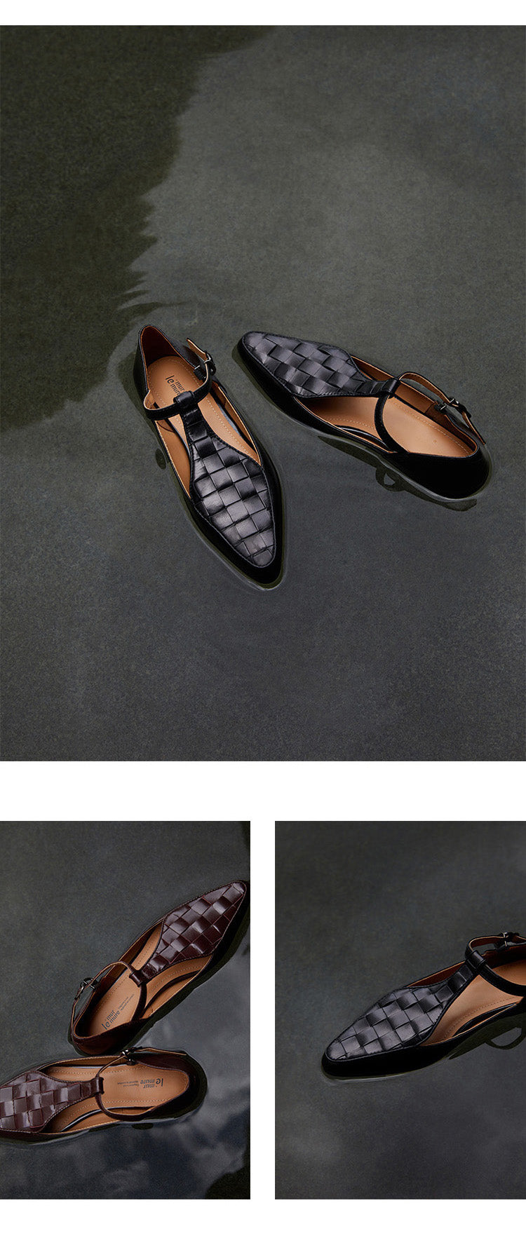The Woven Mary Jane calfskin- Mooner features a T-shaped buckle closure, a plain pattern, a retro style, and a hollow buckle metal braid. It has a low heel (1-3 cm) and a pointed toe, while the heel type is flat-bottomed. The inner material is top layer cowhide, with a deep mouth opening and a laminated cortical feature. The footed is made of first layer cowhide and the upper material is top layer cowhide.