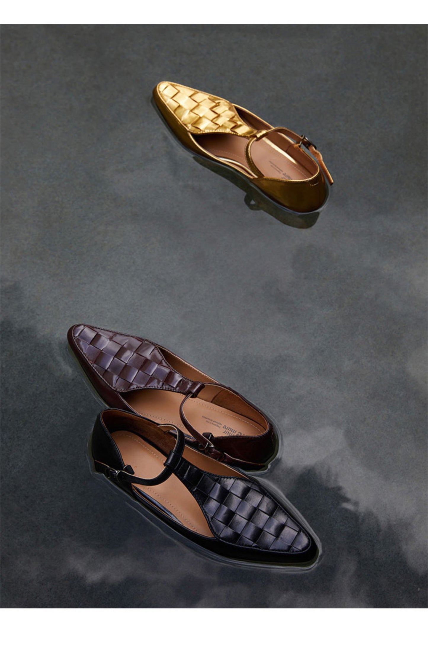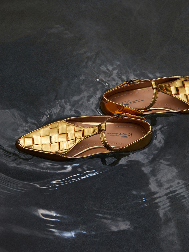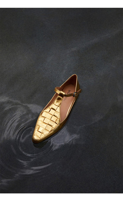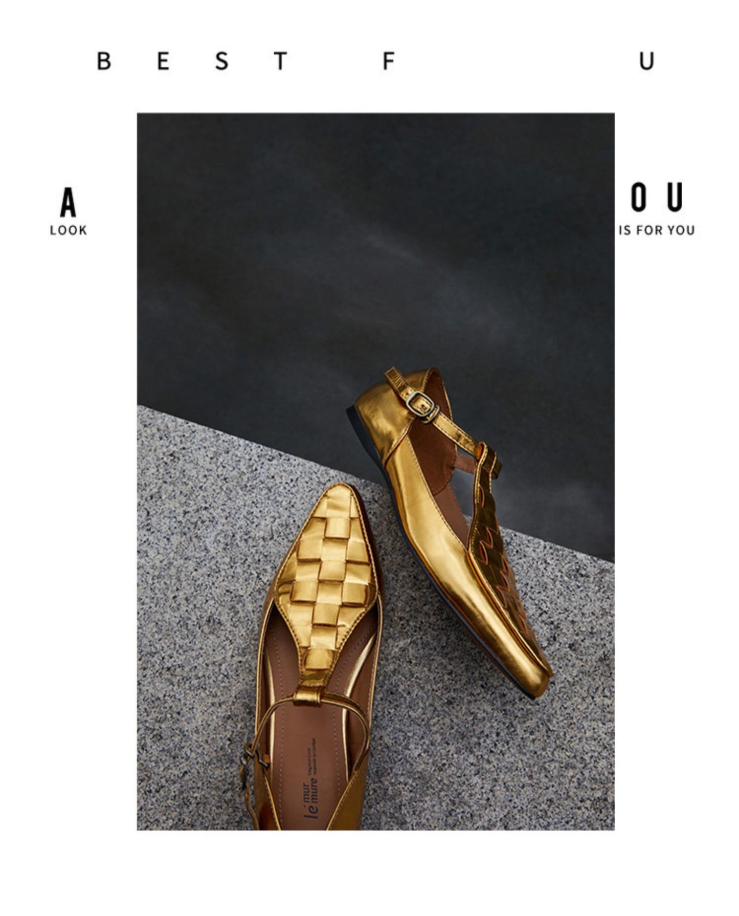 The Woven Mary Jane calfskin- Mooner features a T-shaped buckle closure, a plain pattern, a retro style, and a hollow buckle metal braid. It has a low heel (1-3 cm) and a pointed toe, while the heel type is flat-bottomed. The inner material is top layer cowhide, with a deep mouth opening and a laminated cortical feature. The footed is made of first layer cowhide and the upper material is top layer cowhide.