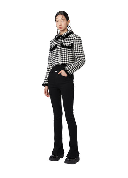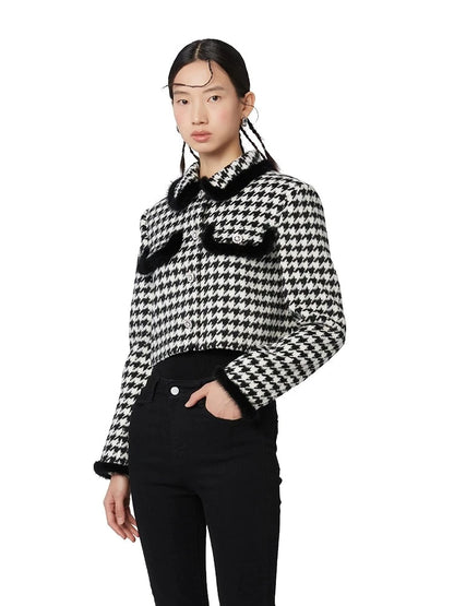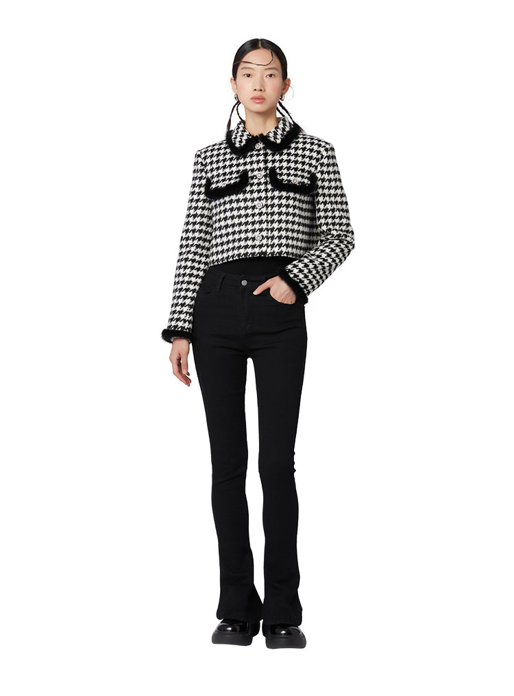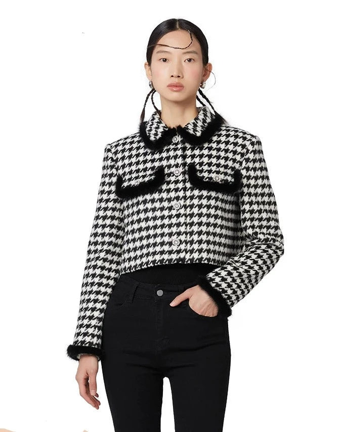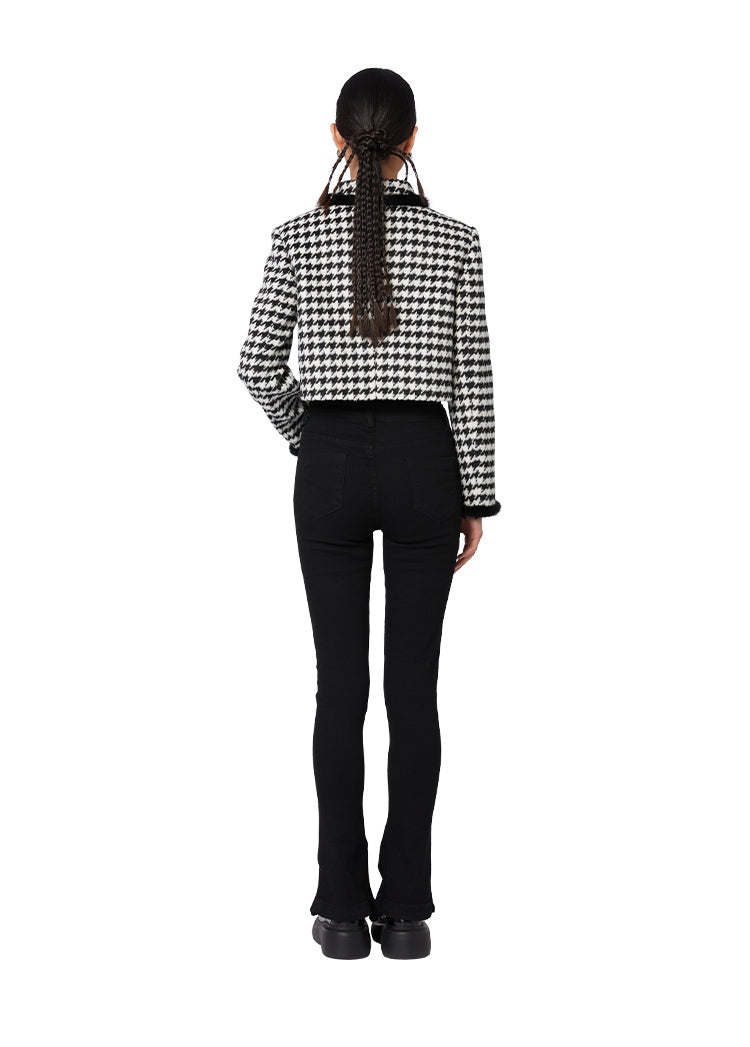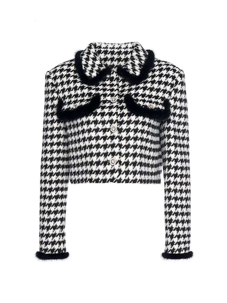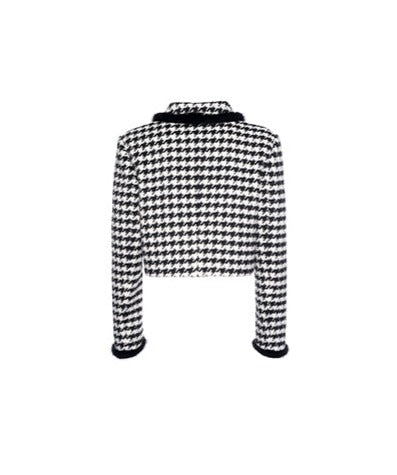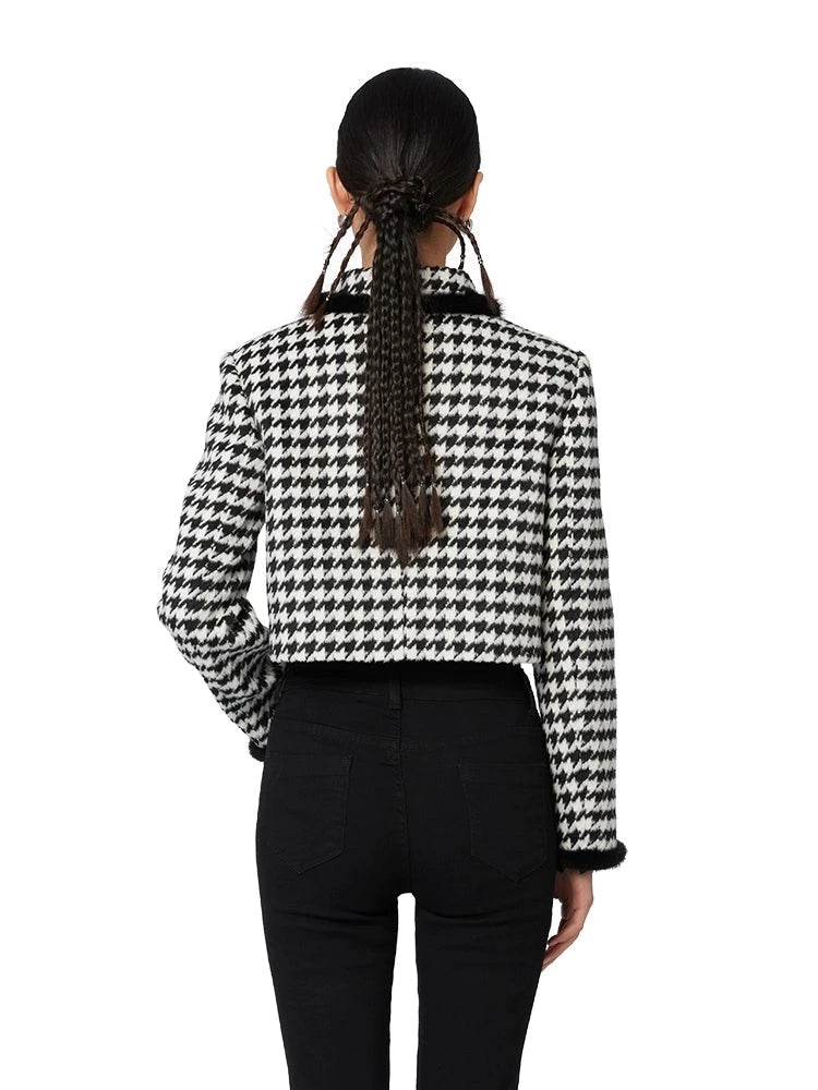 The YES BY YESIR black houndstooth short coat is stylish, mature, and timeless. The elegant polo collar and comprehensive houndstooth pattern make it the perfect formalwear selection for any occasion. The understated silhouette and sophisticated features, such as long sleeves, allows the subtle glamour of this beautiful piece to shine. Wear it to the office, meetings, church, or to any event requiring an exquisite and classy style.
