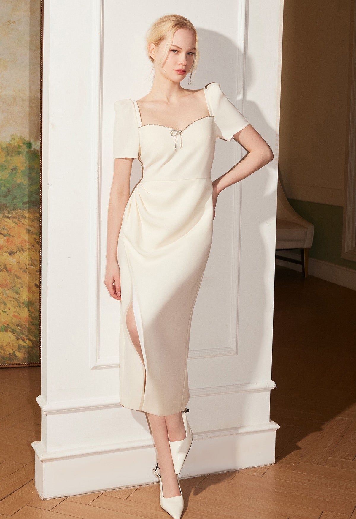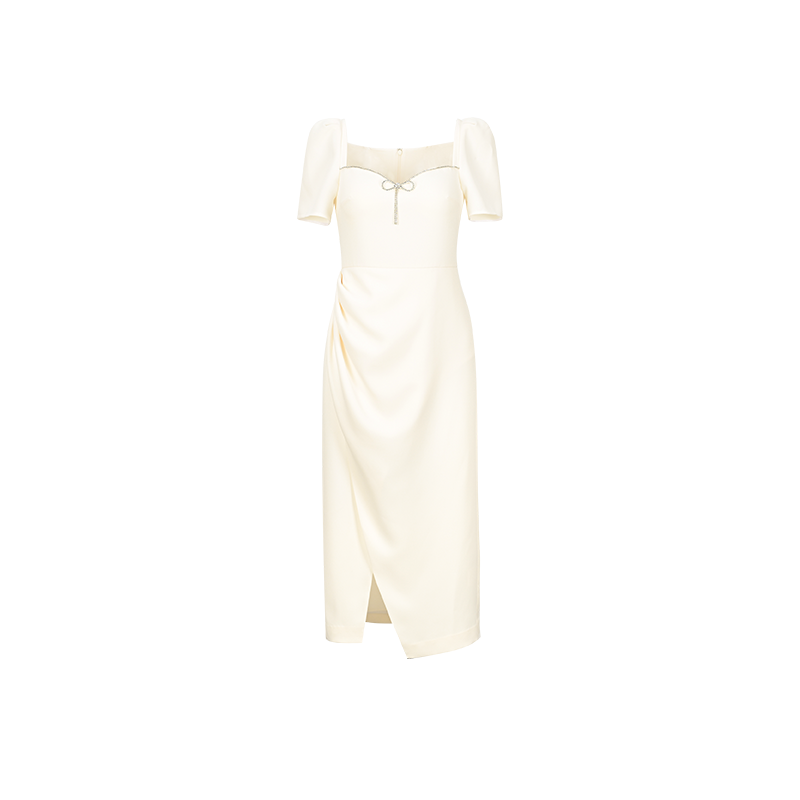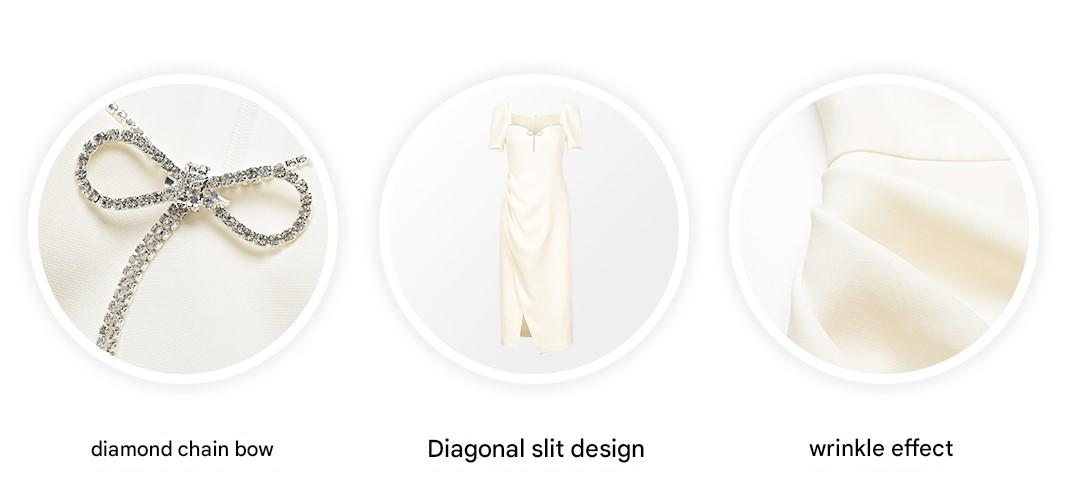 Indulge in luxury fashion with YES BY YESIR's original design spring summer 25 new diamond puff sleeve shirred midi dress. Classy and sophisticated, this dress exudes elegance with its diamond accents and puff sleeves. Elevate your style with this exclusive piece, perfect for any occasion.