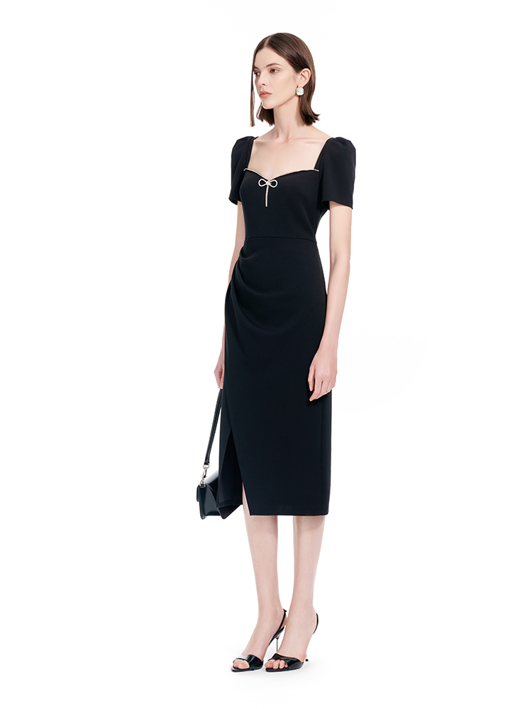 YES BY YESIR Classy puff sleeve shirred midi dress-CAROLINE.