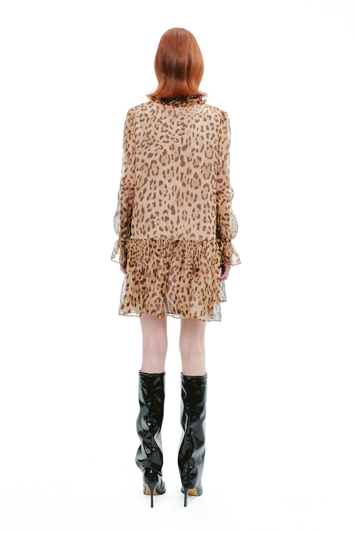 The YES BY YESIR | Ye Qians Wild Grace dress combines elegant design with chic flair, featuring a romantic ruffle detail and a softly contoured, feminine silhouette. Rendered in a subtle leopard print, this dress balances boldness with sophistication, making it a refined choice for those seeking timeless style with a modern edge.