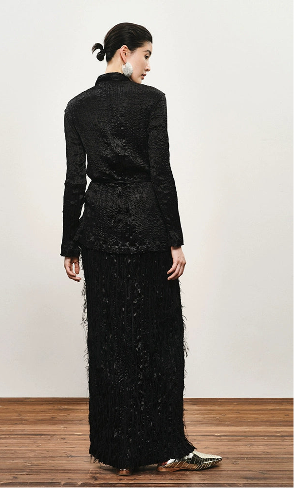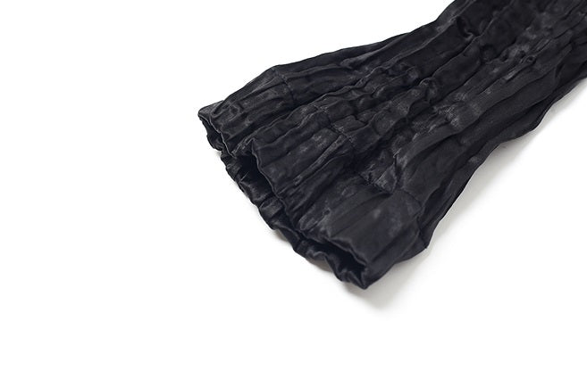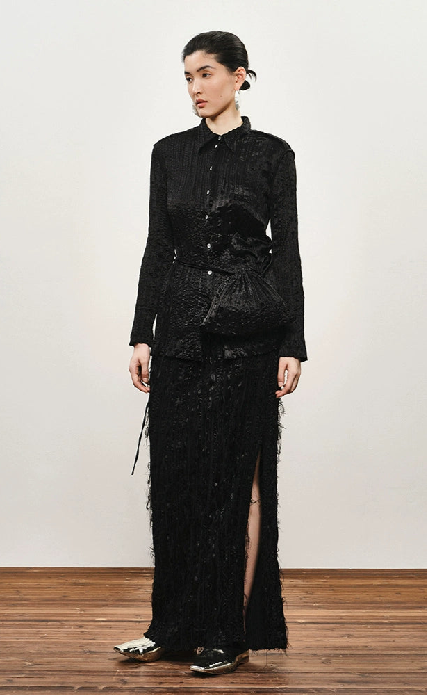 Elevate your autumn wardrobe with the Black Pleated Texture Shirt. Crafted with a satin lapel and a slim silhouette, this shirt features elegant pleated detailing and a coordinating belt to define your waist. Designed for both style and sophistication, it offers a polished look perfect for professional or upscale casual settings.