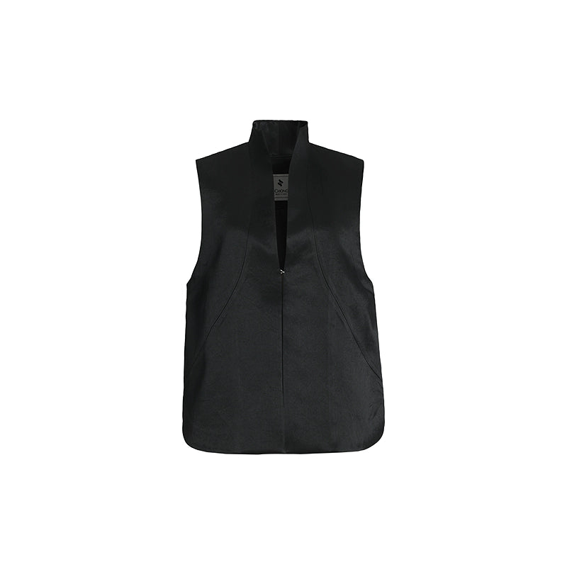 This  sleeveless vest features a minimalist stand-up collar and a clean placket design, delivering an elegant yet understated look. Its straight cut provides a flattering silhouette, perfect for layering or wearing alone in warm weather. Crafted for a refined style, this vest balances simplicity with sophistication, making it a versatile addition to any wardrobe.