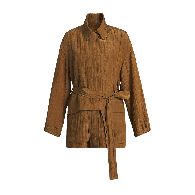 Elevate your wardrobe with the stand-collar silhouette trench crepe jacket from the collection. Crafted from premium crepe fabric, this jacket offers a refined structure and a sleek stand collar that enhances its modern trench design. Its tailored silhouette ensures a flattering fit, making it an ideal choice for both professional settings and sophisticated casual wear. Durable yet lightweight, this jacket combines timeless style with expert craftsmanship for a versatile outerwear essential.
