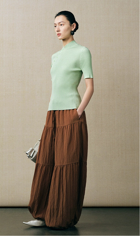 This knit top features a sleek stand-up collar and a slim fit that contours the body for a flattering silhouette. The diagonal placket adds a modern twist to traditional Chinese design, combining elegance with subtle allure. Crafted for comfort and style, it’s an ideal choice for those seeking a refined yet captivating look.
